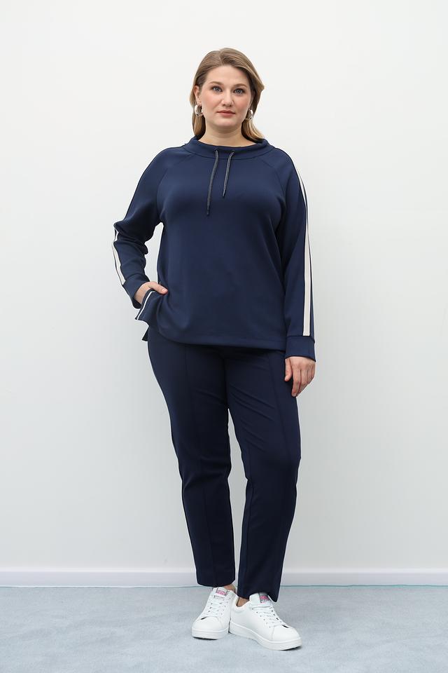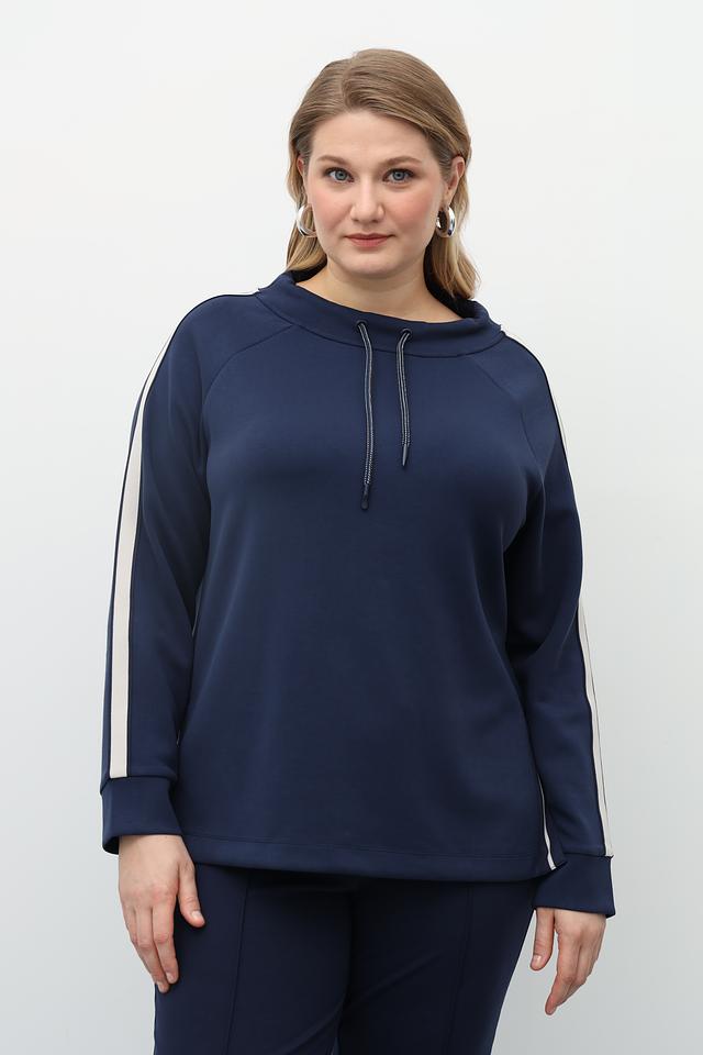 Пуловер имеет свободный крой, что позволяет чувствовать себя свободно и непринужденно. Декоративные белые полосы по бокам добавляют динамичности и спортивного шика. Модель дополнена капюшоном со шнурком для удобства регулировки.