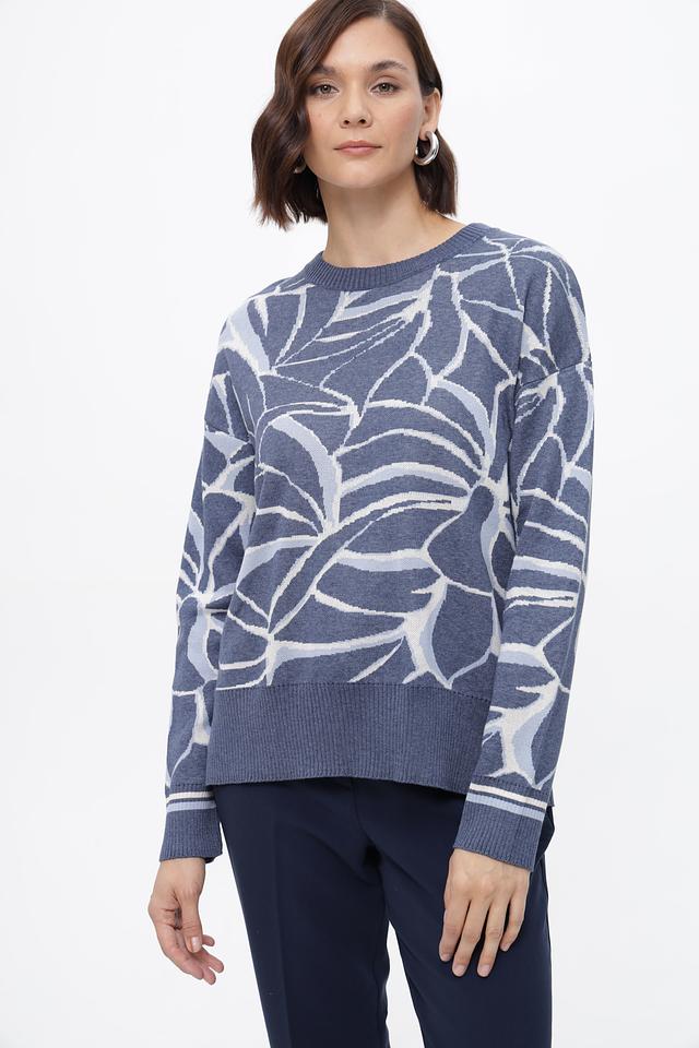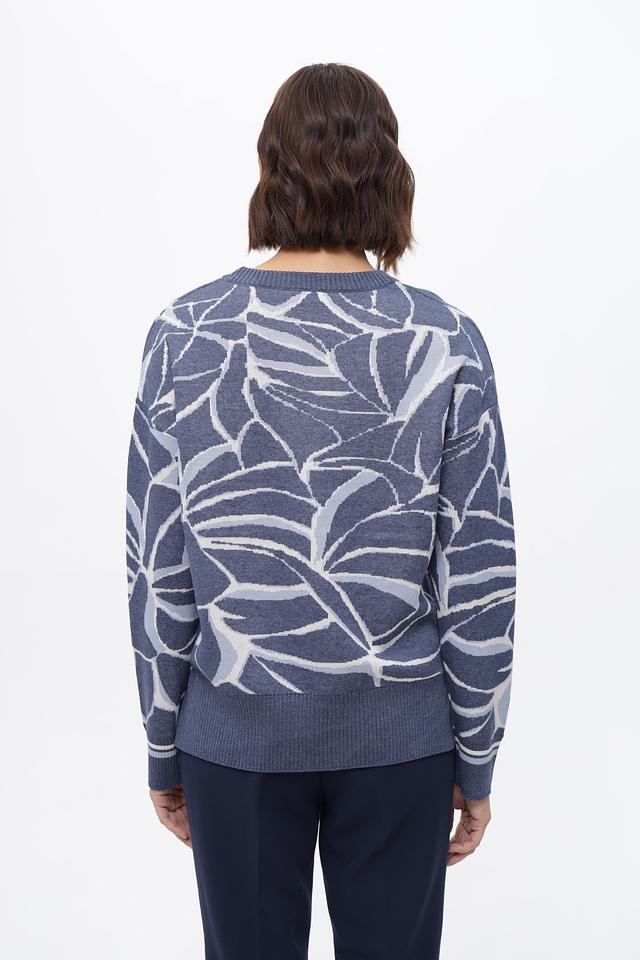 Этот стильный пуловер Olsen станет отличным дополнением к вашему гардеробу. Он выполнен в спокойной синей цветовой гамме и украшен оригинальным принтом, имитирующим листья тропических растений.