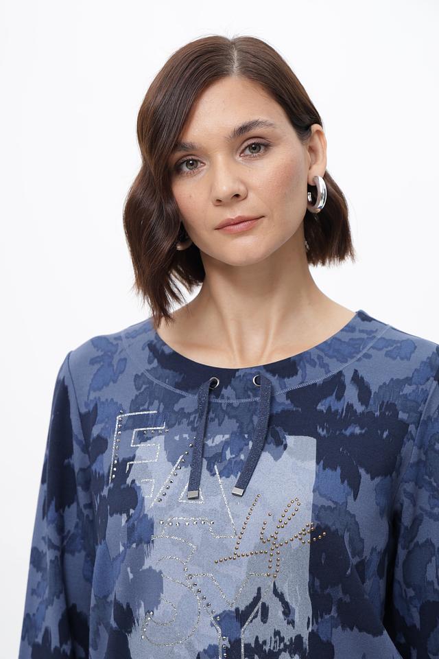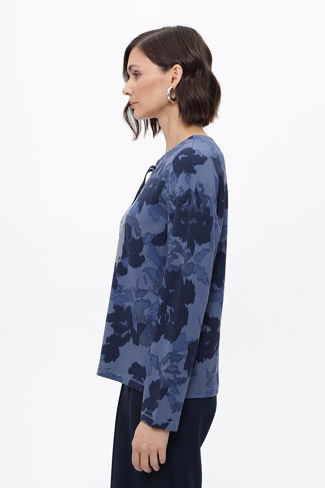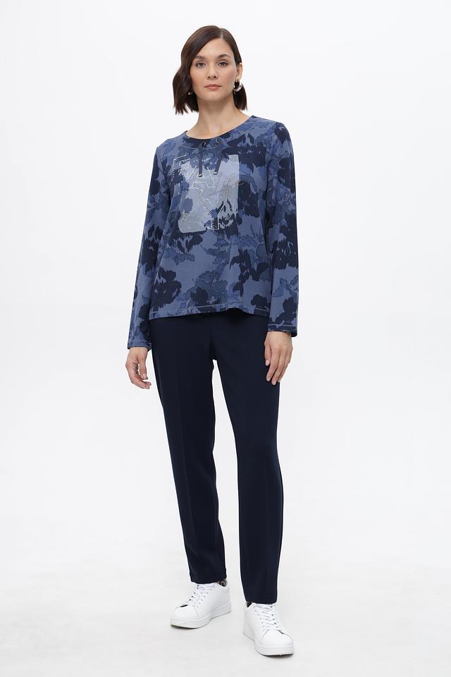 Стильный пуловер Olsen синего цвета с цветочным принтом и оригинальным декором. Изготовлен из мягкой вискозы с добавлением эластана для комфорта и удобства. Идеально подходит для создания повседневных образов. Состав: вискоза 92%, эластан 8%