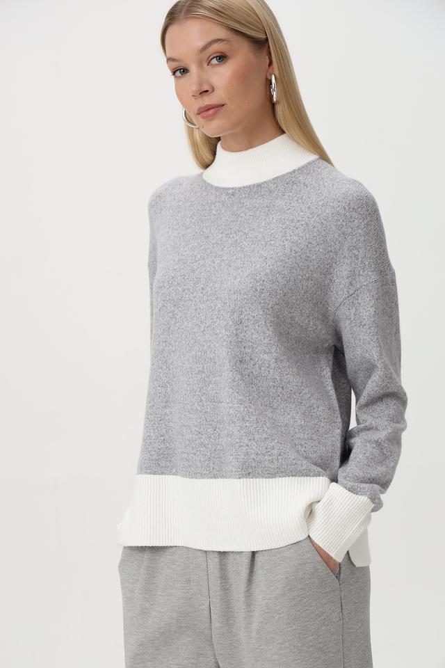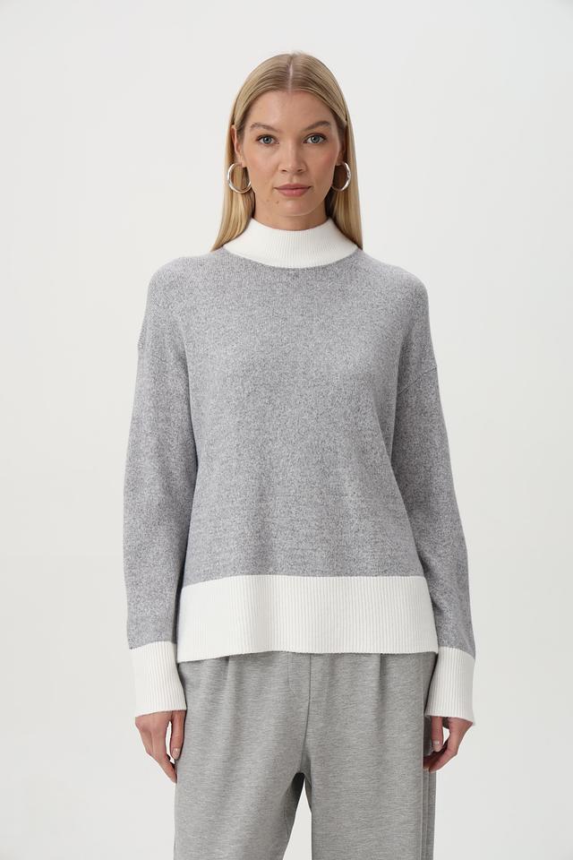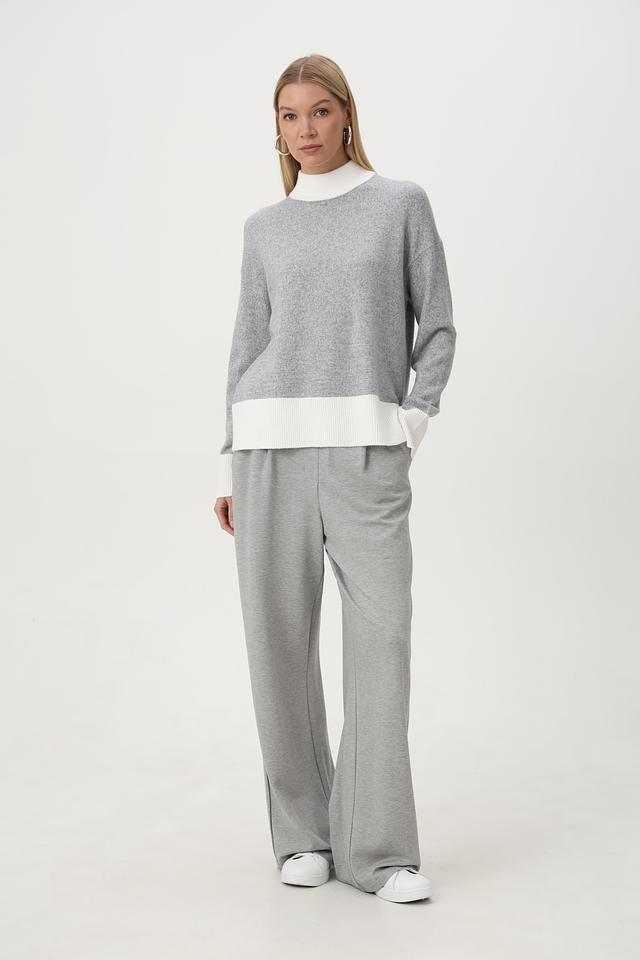 Пуловер имеет серый цвет с контрастной белой отделкой на горловине, манжетах и нижней части изделия. Это придает ему особый шарм и делает его более интересным.