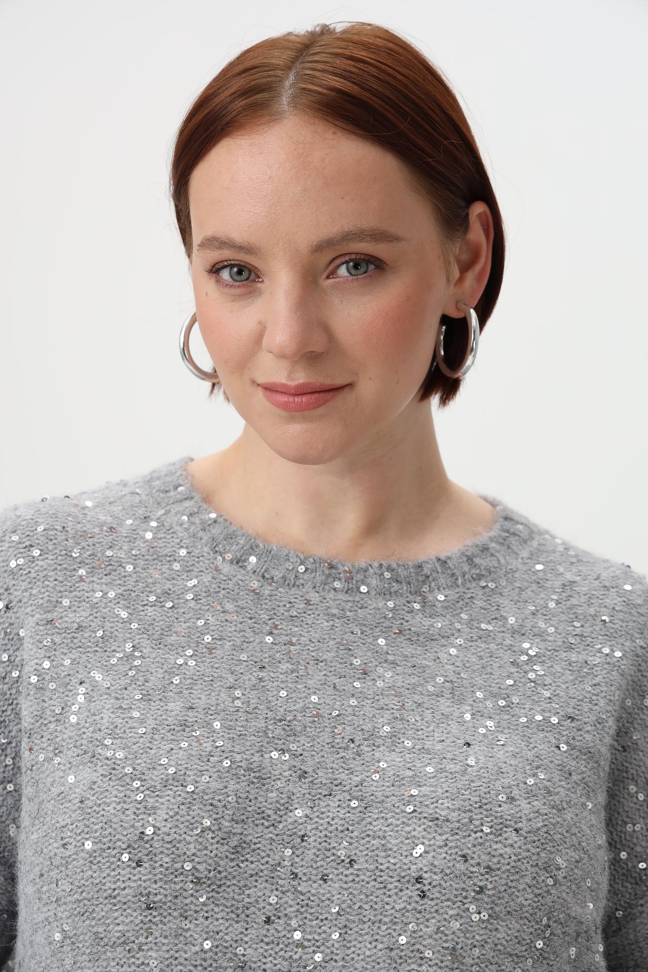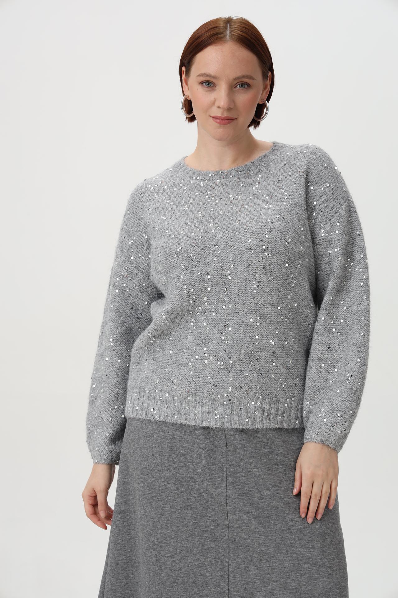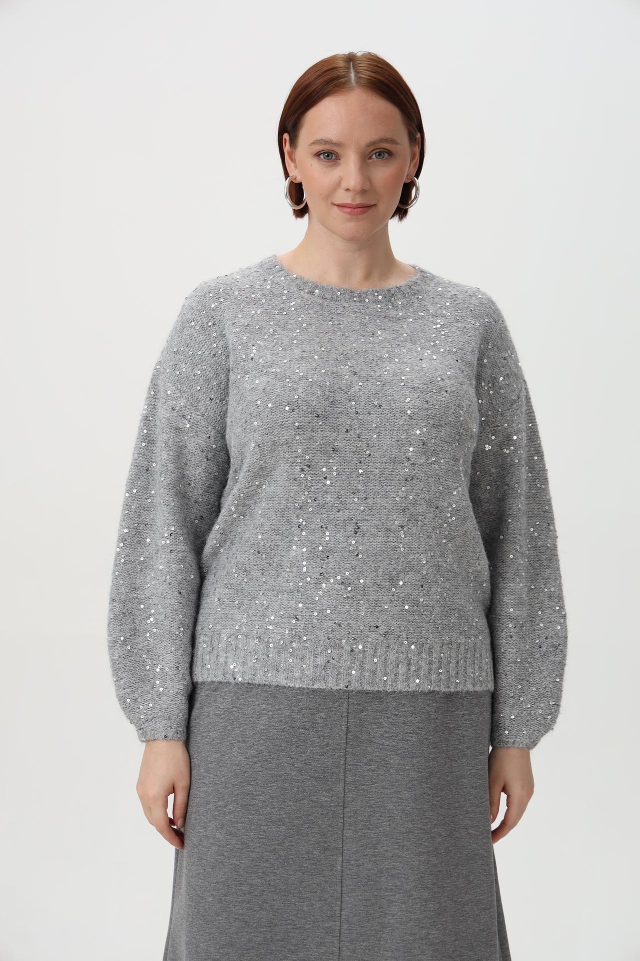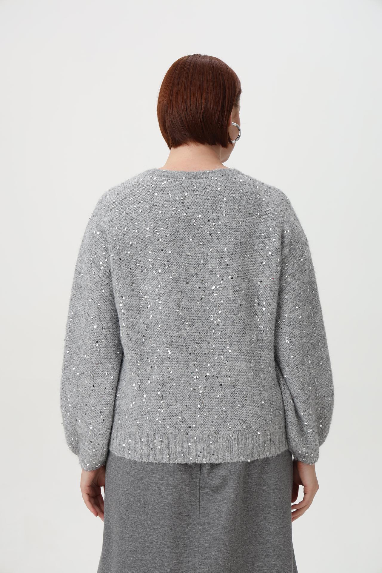 - Дизайн: Классический прямой крой с круглым вырезом и длинными рукавами. Деликатное расположение пайеток по всей поверхности придает пуловеру праздничный вид.