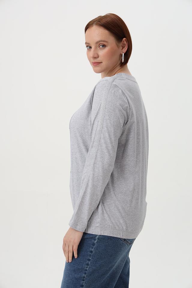 Модель имеет прямой, слегка свободный крой, длинные рукава и круглый вырез горловины. Основной цвет лонгслива – серый меланж, который легко сочетается с различными элементами гардероба.