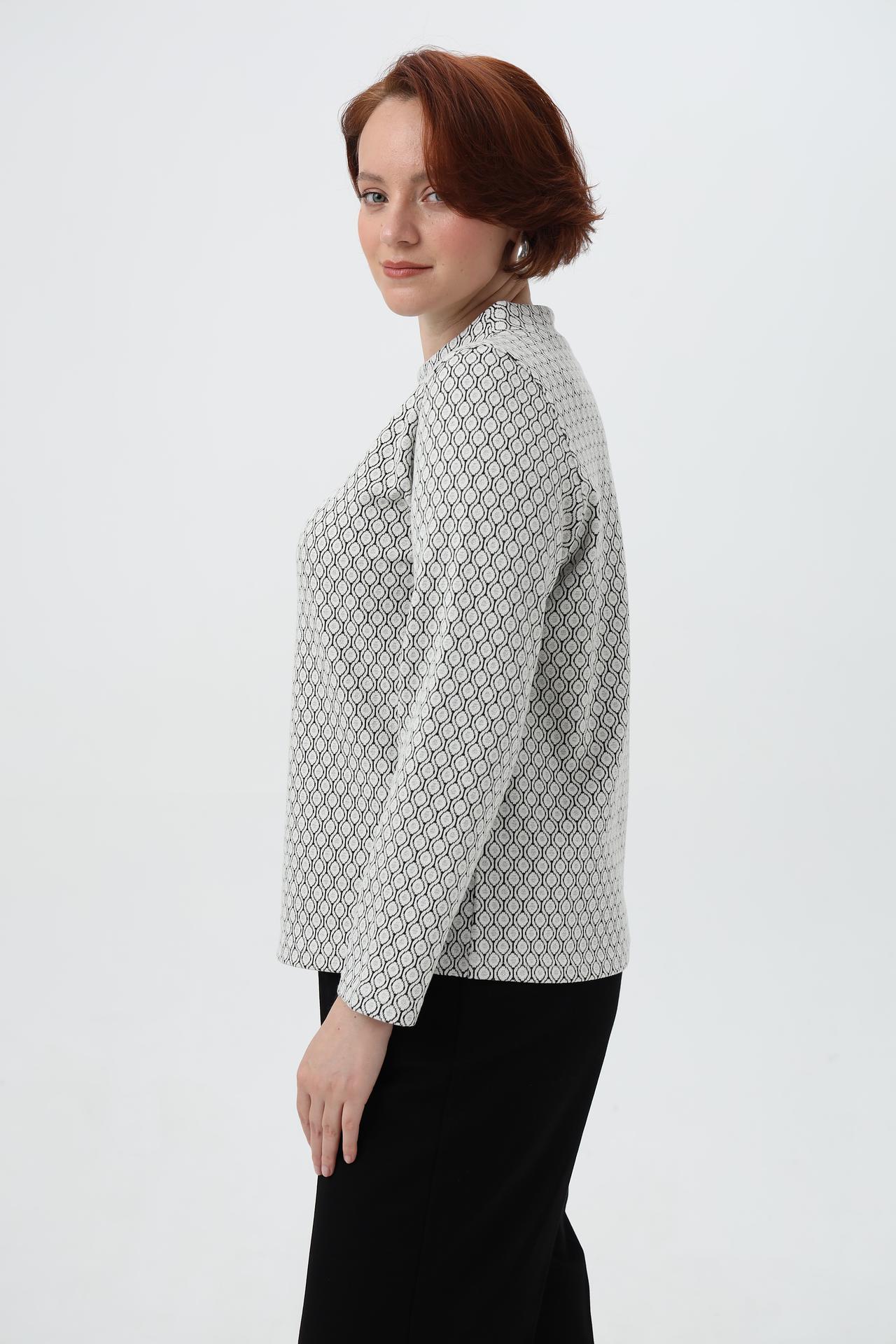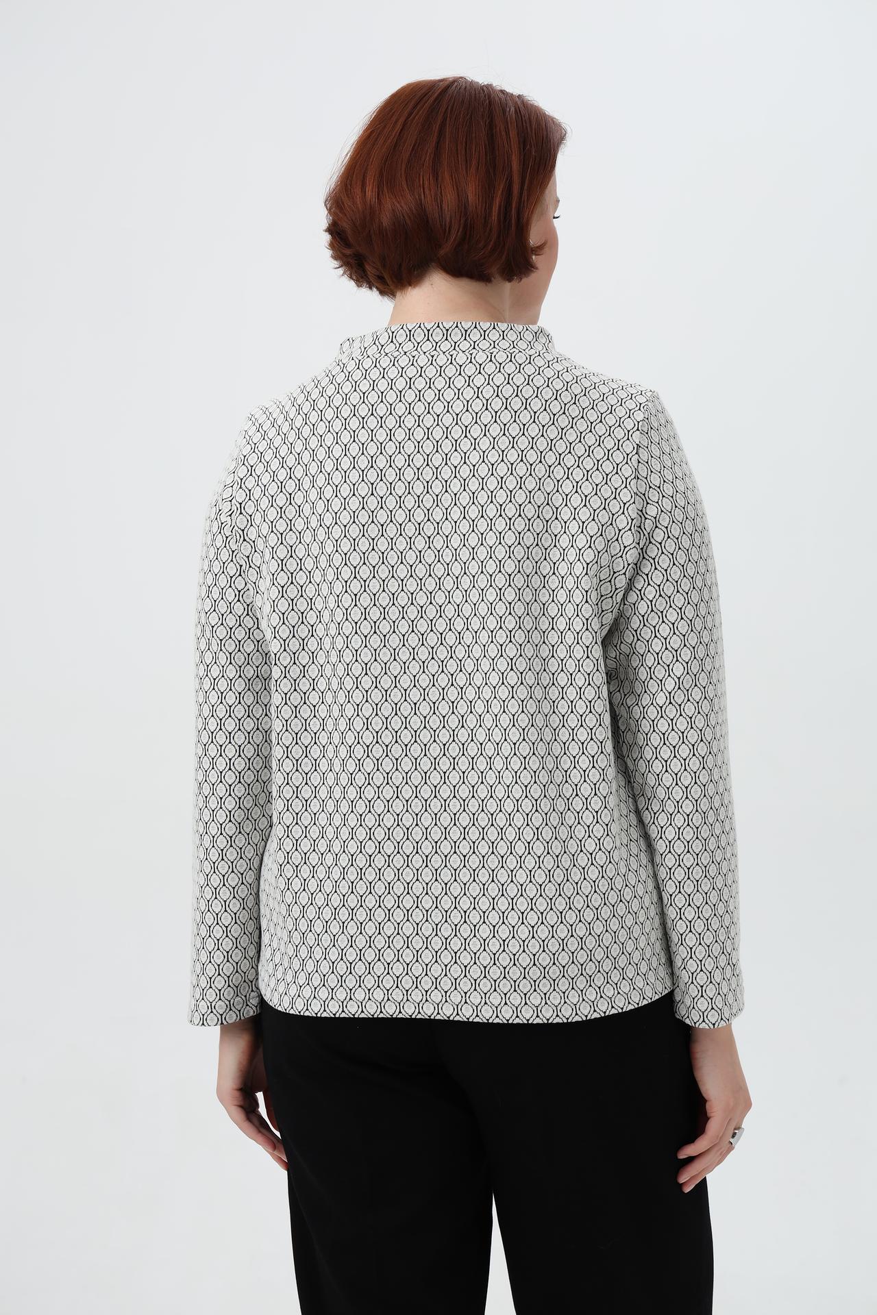 - Дизайн: Классический крой с воротником-стойкой и длинными рукавами. Геометрический принт в черно-белых тонах выглядит стильно и актуально.