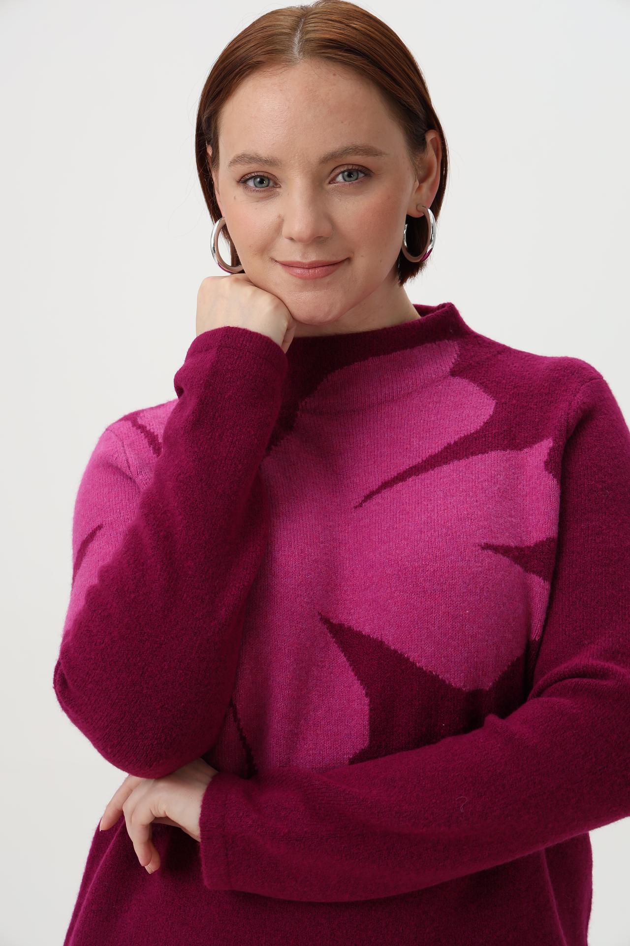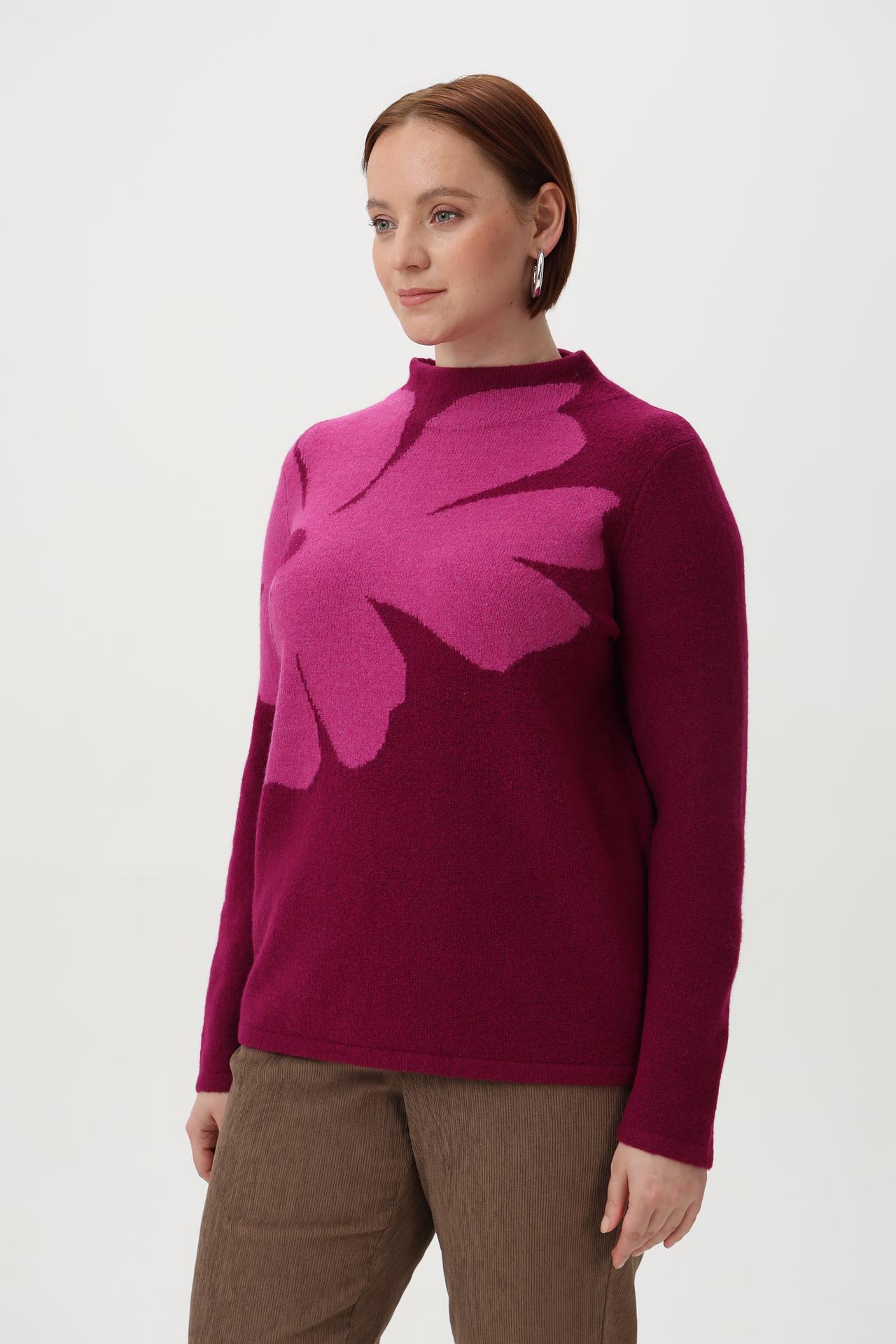 Элегантный пуловер от Olsen станет изысканным дополнением вашего гардероба. Оригинальный принт в виде крупного цветка, выполненный в контрастных оттенках фуксии, придает изделию особое очарование. Модель с высоким воротником-гольф и длинными рукавами обеспечивает комфорт и тепло в прохладные дни. Пуловер идеально подходит для создания как повседневных, так и более нарядных образов.