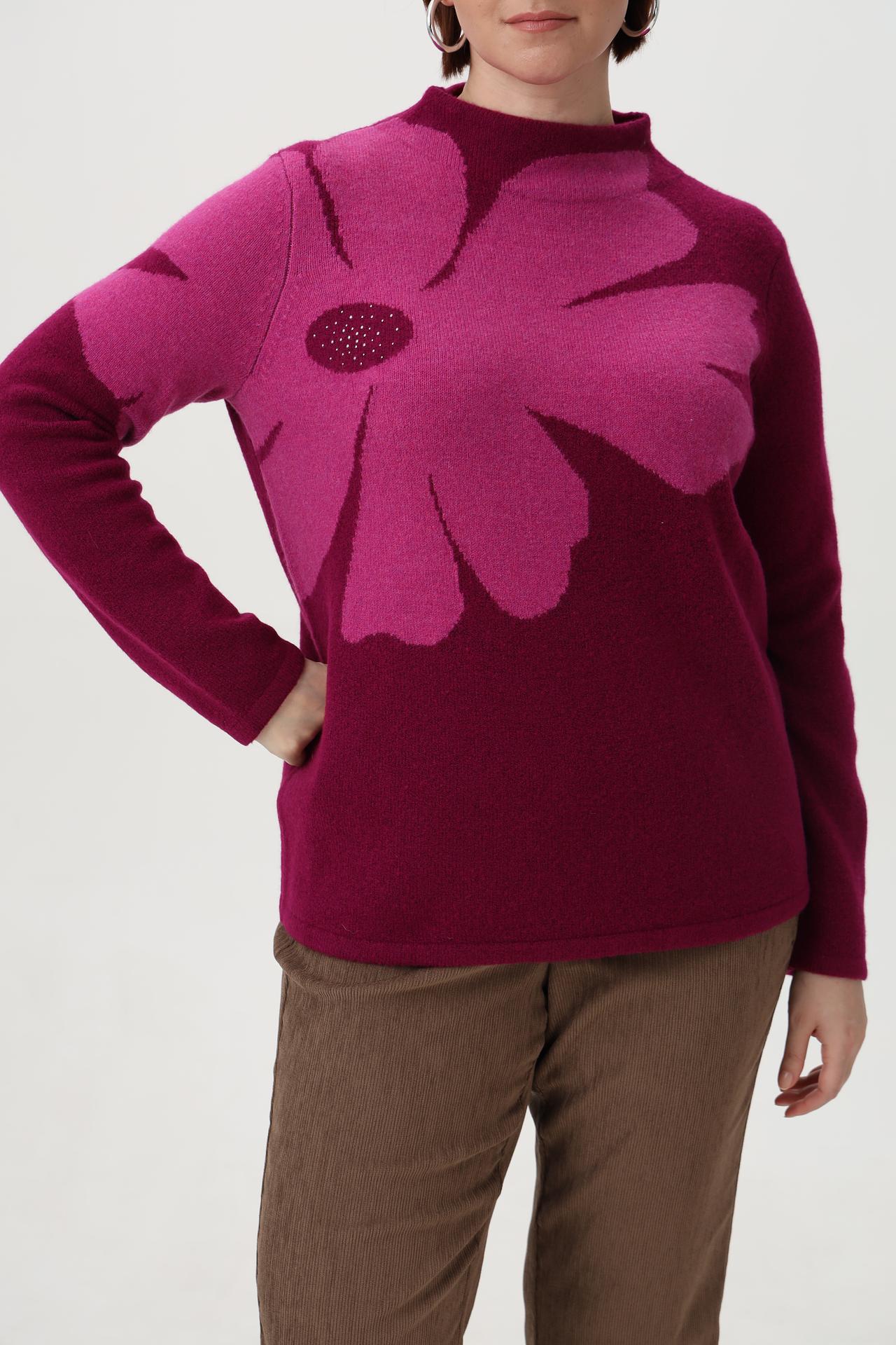 - Дизайн: Яркий цветочный узор на верхней части пуловера, выполненный в технике интарсия, и однотонная нижняя часть создают стильный контраст. Несколько декоративных страз в центре цветка добавляют блеска.