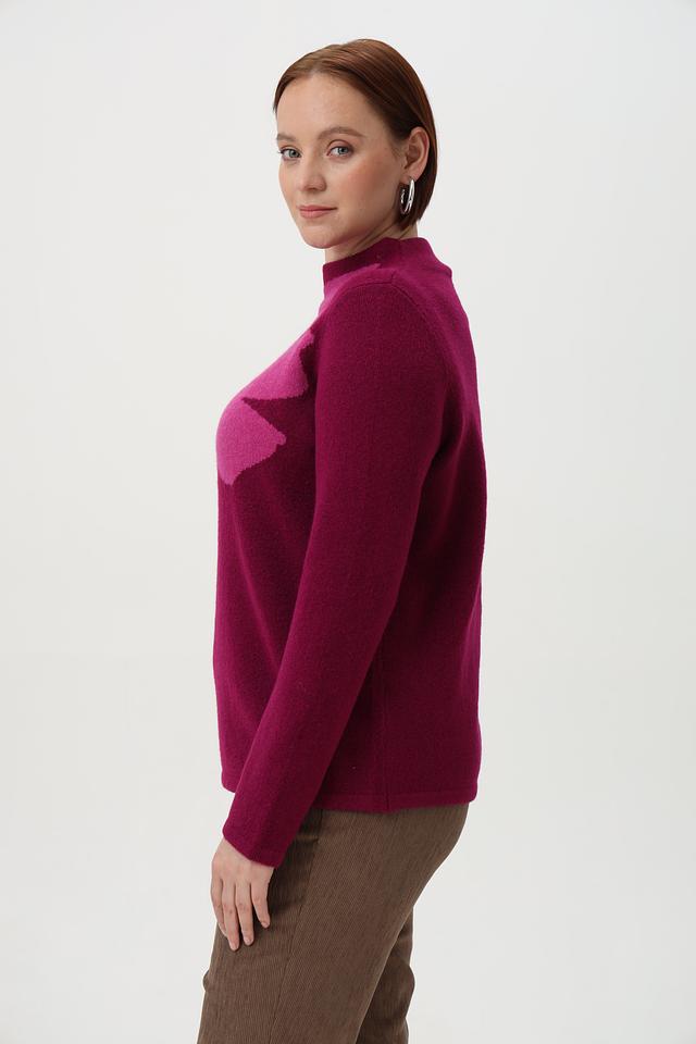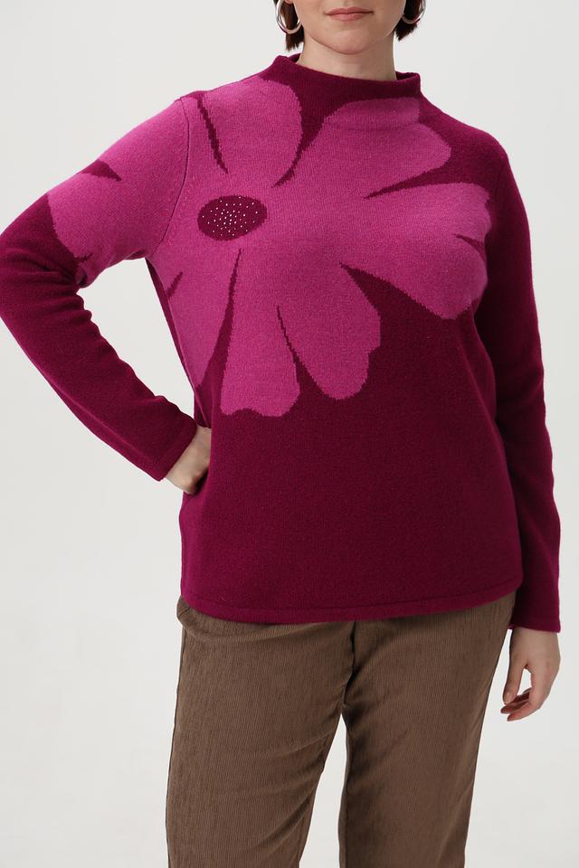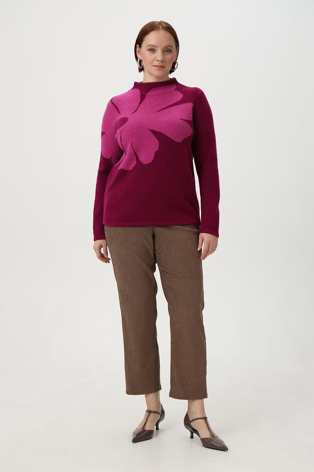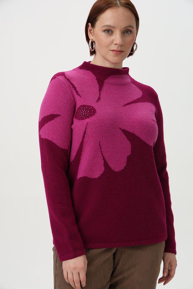 Пуловер имеет классический крой с длинными рукавами и воротником-стойкой. Главной особенностью модели является крупный цветочный принт, выполненный в оттенках фуксии и розового, который добавляет образу женственности и оригинальности.