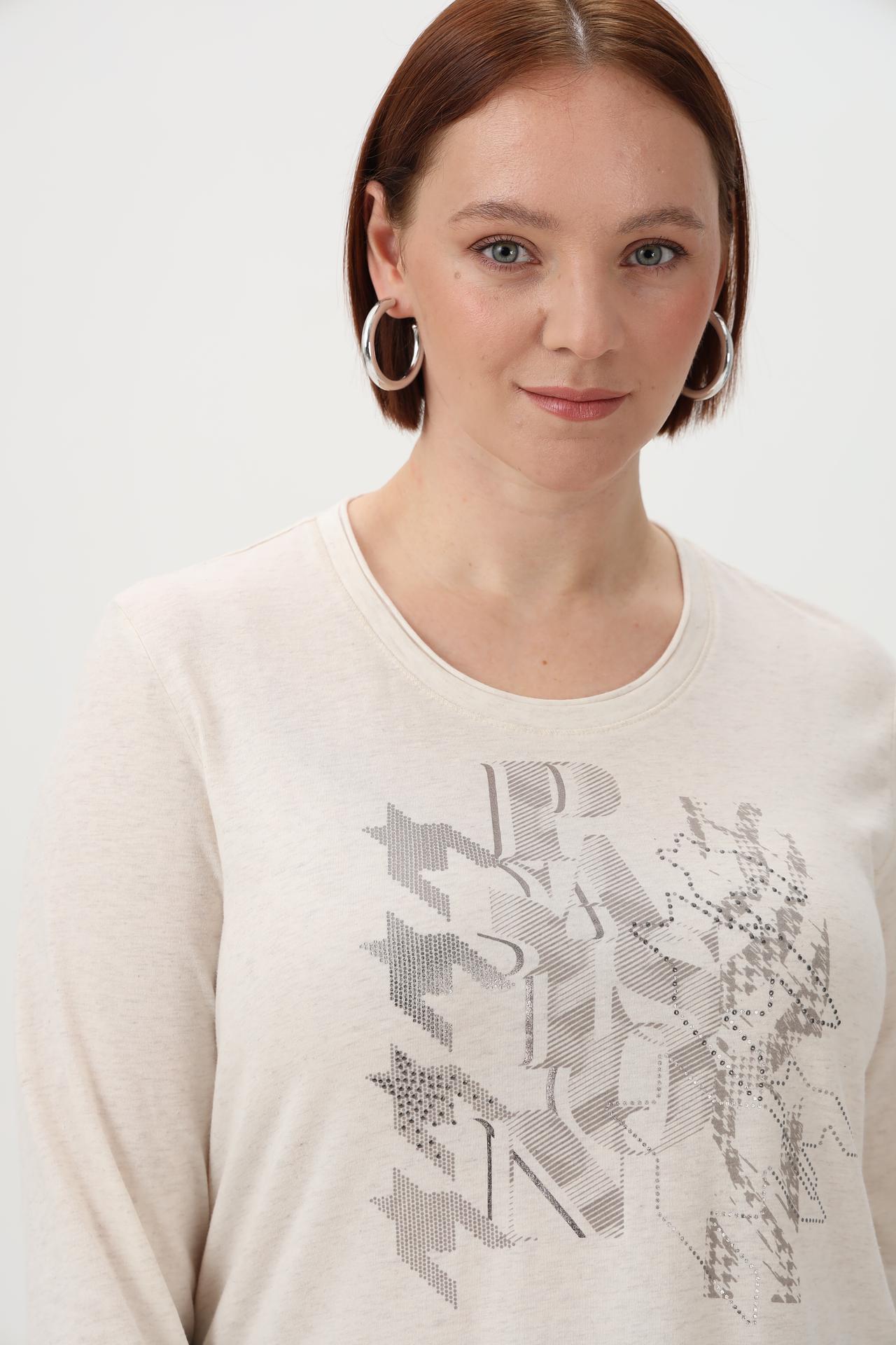 Базовый бежевый лонгслив от Olsen – идеальное дополнение к повседневному гардеробу. Модель с длинным рукавом и округлым вырезом горловины дополнена стильным серебристым принтом, который добавит изюминку любому образу. Лонгслив выполнен из смесовой ткани, сочетающей натуральный хлопок и практичный полиэстер, что обеспечивает комфорт и долговечность.