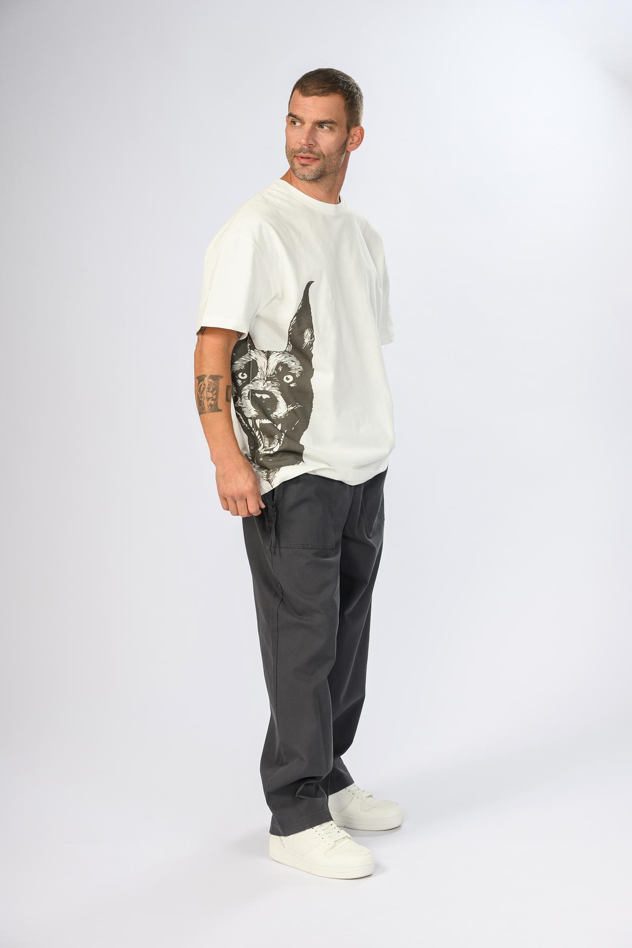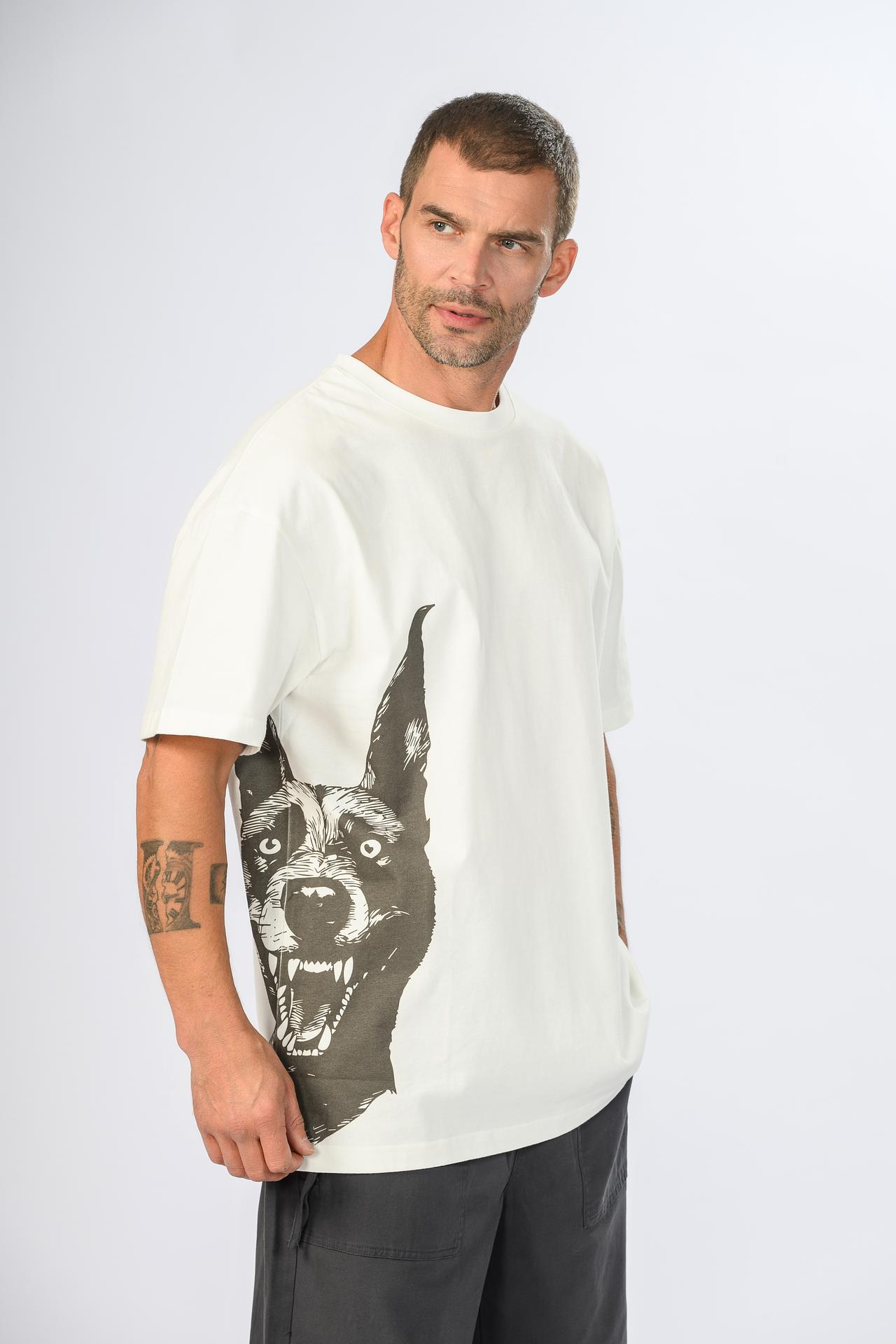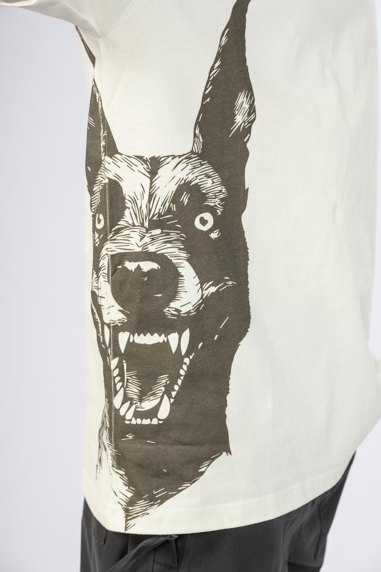 - Оригинальный принт: Выразительный рисунок с изображением собаки добавляет футболке уникальности.