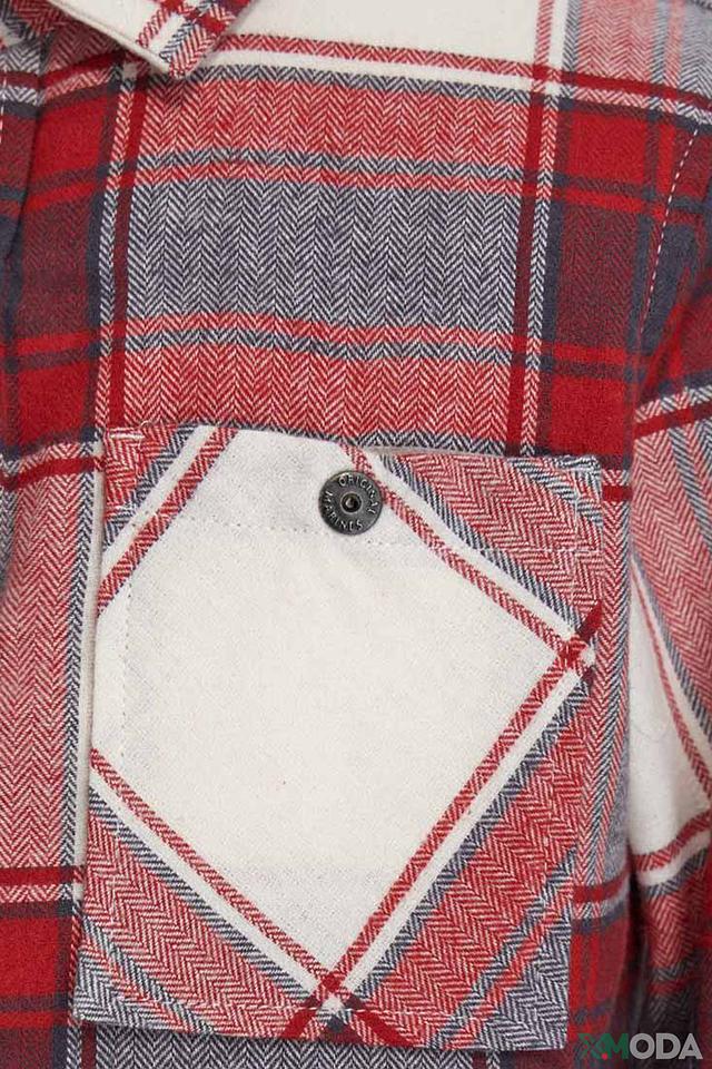 Рубашка имеет классический крой с длинными рукавами и застежкой на пуговицы. Яркий клетчатый принт в сочетании красного, белого и серого цветов делает эту рубашку особенно привлекательной и выделяющейся.
