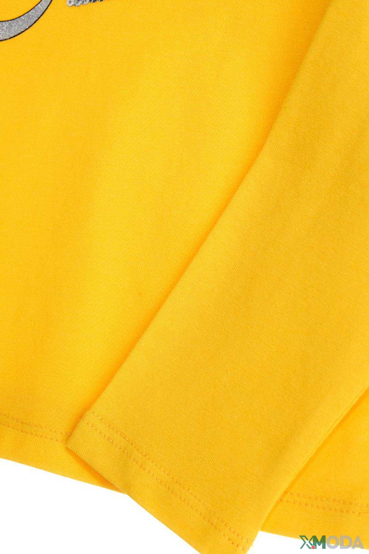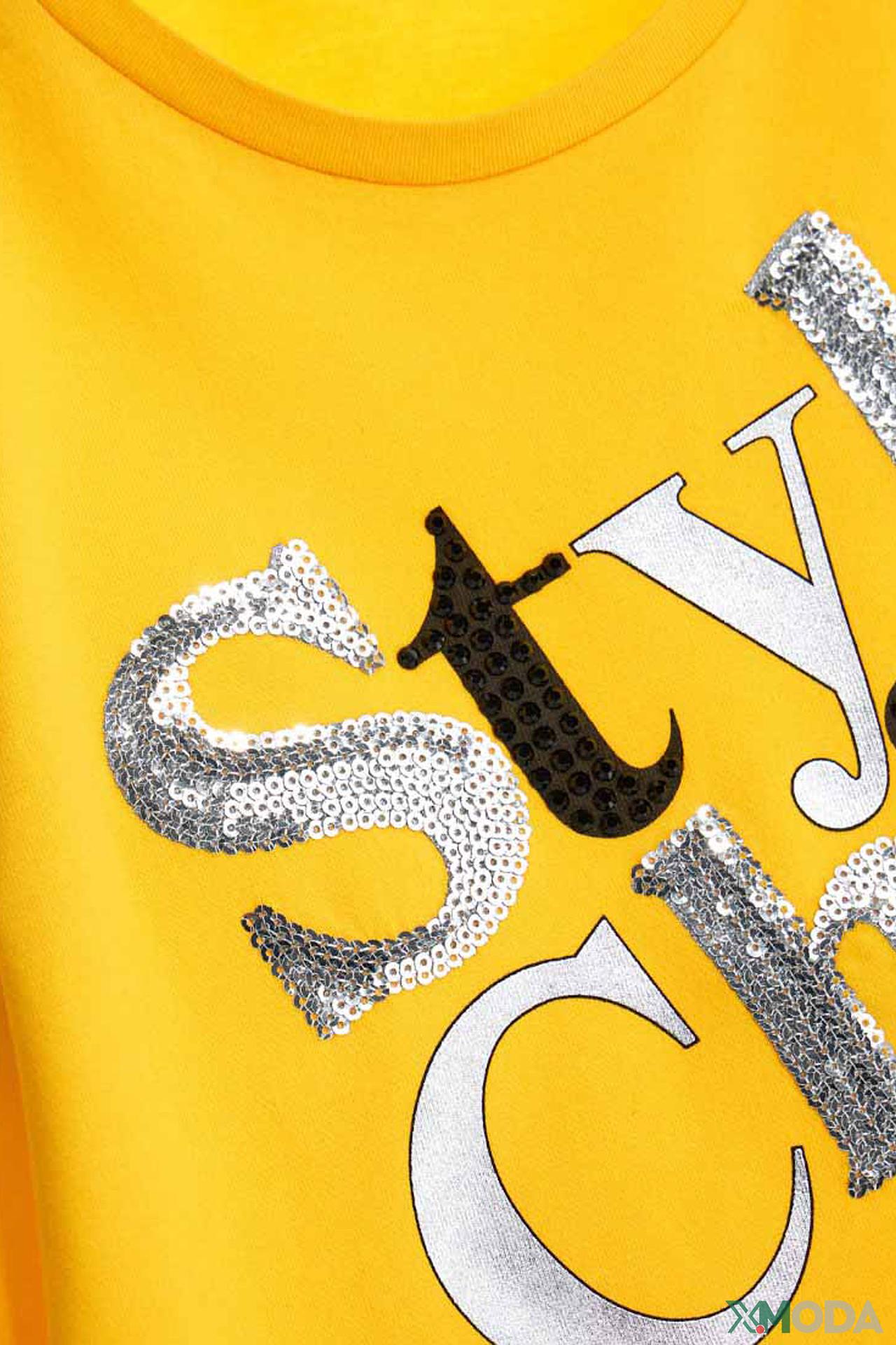 - Яркий дизайн: Желтый цвет и оригинальная надпись с блестками делают эту футболку незаменимой вещью в гардеробе каждой девочки.