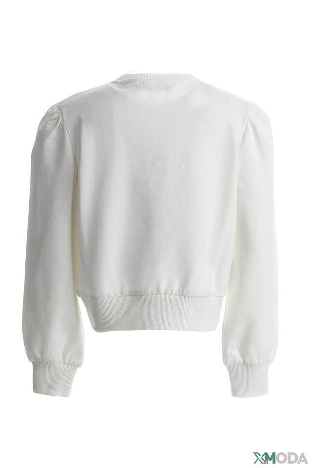 Свитшот имеет удобный крой, слегка расширенный к низу, и манжеты на рукавах и по низу изделия, обеспечивающие плотное прилегание. Рукава – пышные, слегка расклешенные к низу, что придает образу игривость и кокетство. Вырез горловины – круглый, классический.