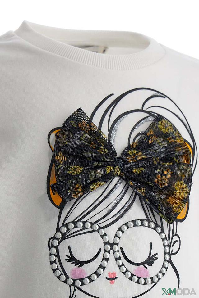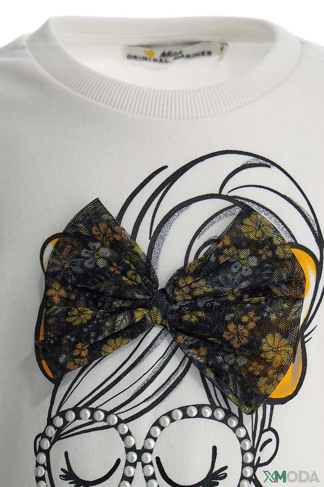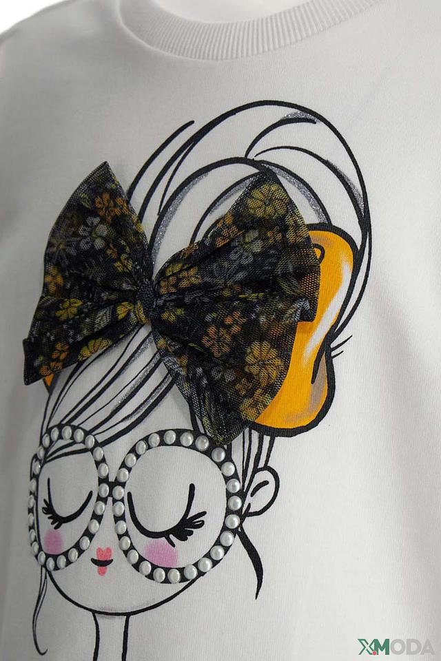 Этот очаровательный свитшот от Original Marines станет отличным дополнением к гардеробу юной модницы. Выполненный в белом цвете, он украшен оригинальным принтом с изображением девушки в больших очках и бантиком.