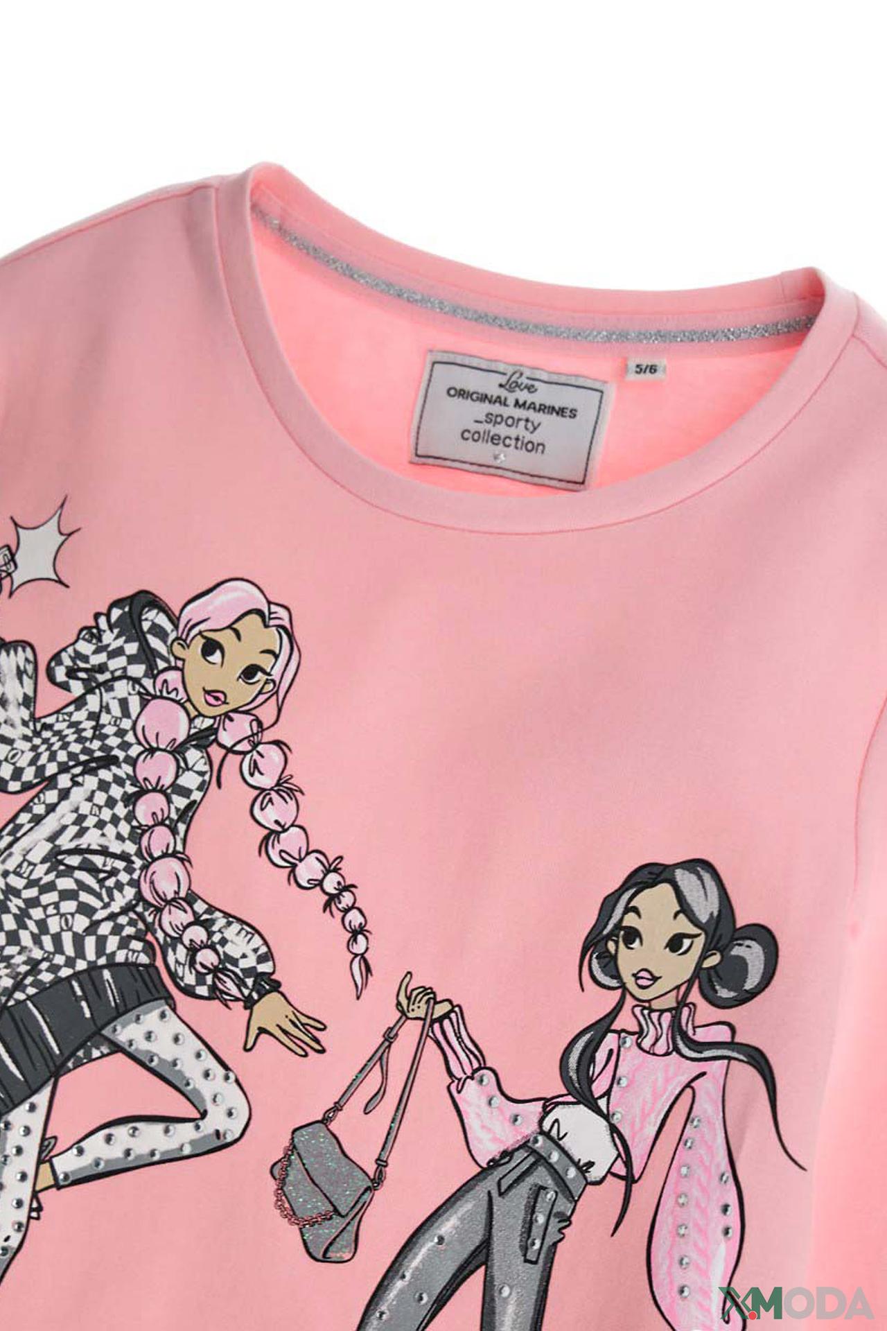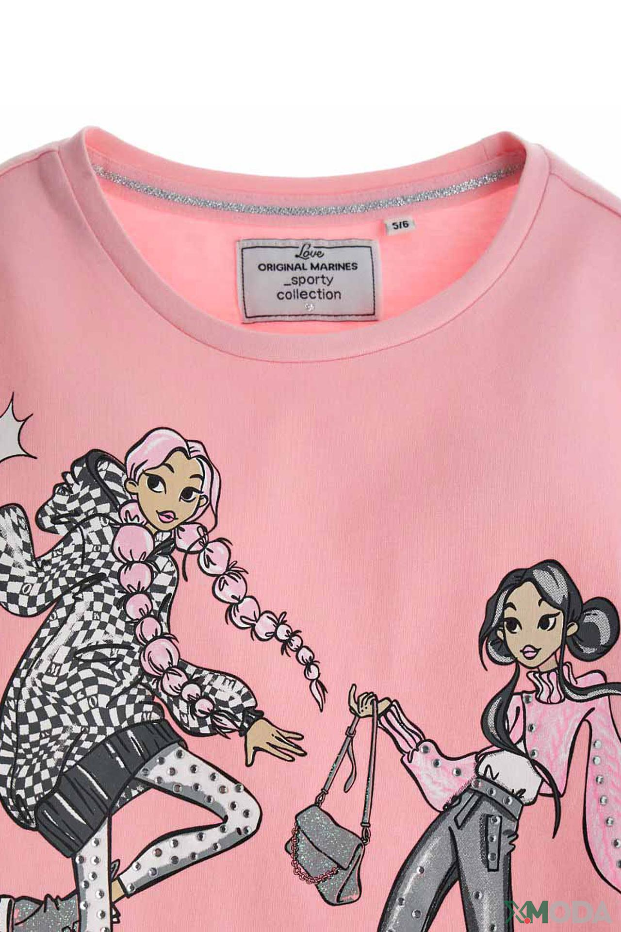 Очаровательная футболка от Original Marines – идеальный выбор для юных модниц! Эта футболка, выполненная из мягкого и приятного к телу материала (95% хлопок, 5% эластан), обеспечит комфорт и свободу движений вашей девочке. Стильный принт с изображением модных девчонок, украшенный сверкающими стразами, непременно привлечет внимание и подчеркнет индивидуальность.