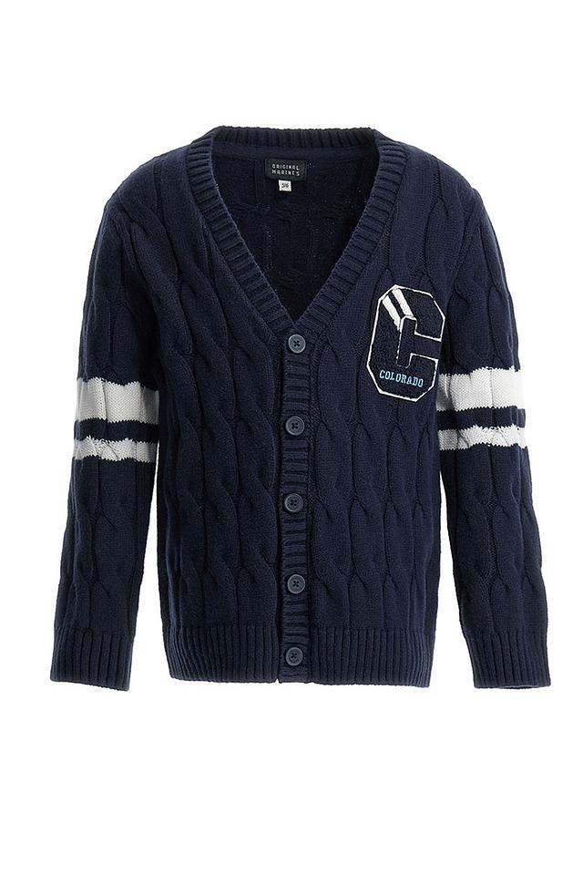 Тёмно-синий кардиган Original Marines для мальчика, выполнен из мягкого трикотажа с добавлением шерсти. Модель с V-образным вырезом, застёжкой на пуговицы и декоративной нашивкой. Состав: хлопок 60%, полиамид 30%, шерсть 10%. Состав: хлопок 60%, полиамид 30%, шерсть 10%