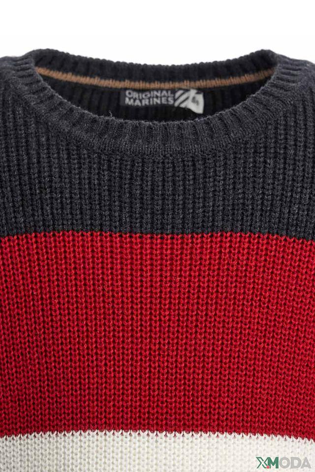 Этот джемпер от Original Marines станет отличным дополнением к гардеробу вашего мальчика. Модель выполнена в тёмно-синем цвете с яркими красными и белыми полосами, что придает ей динамичный и привлекательный вид.