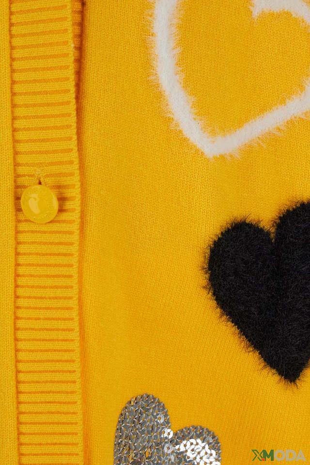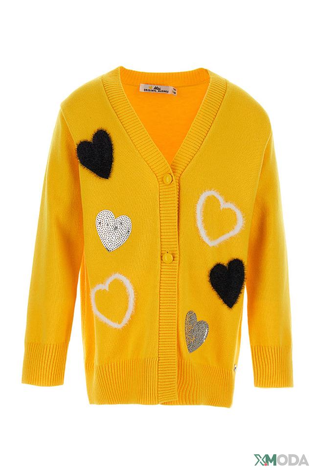Этот очаровательный кардиган от Original Marines станет прекрасным дополнением к гардеробу юной модницы. Яркий жёлтый цвет и милые аппликации в виде сердечек делают его особенно привлекательным.