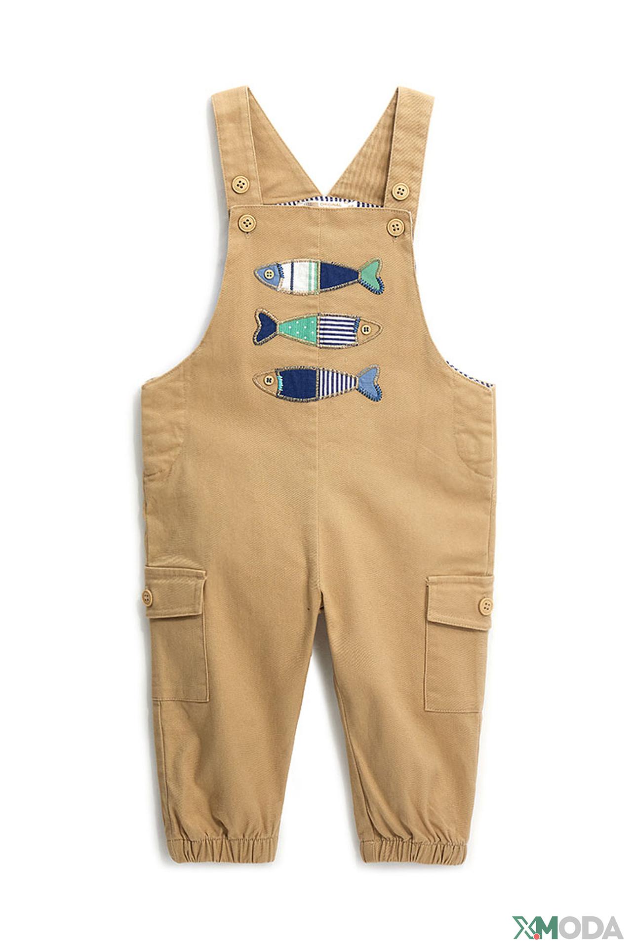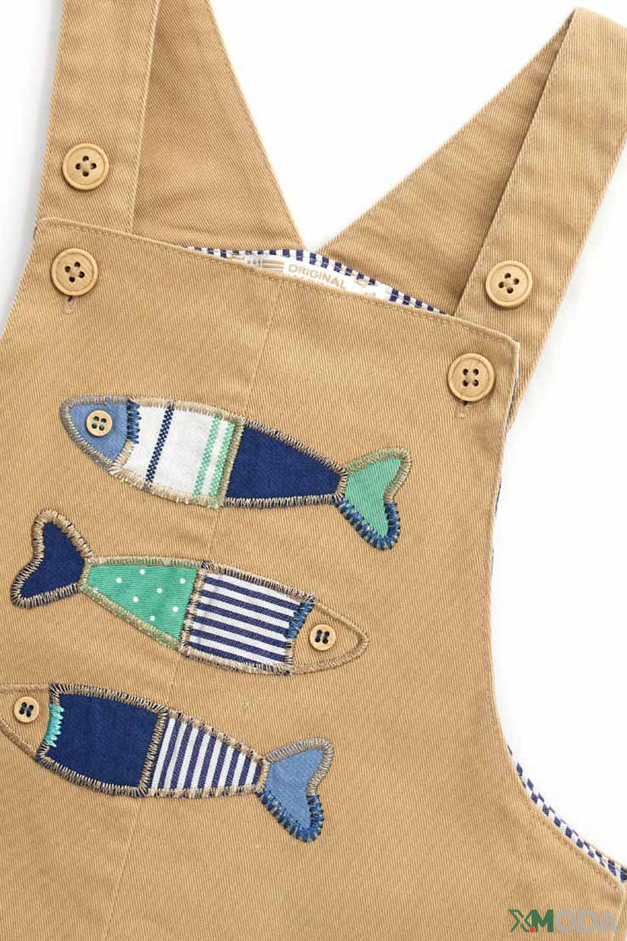 Бежевый детский полукомбинезон украшен тремя яркими аппликациями в виде забавных рыбок на груди, добавляя образу игривости и уникальности. Контрастная полосатая подкладка придает оригинальности, а функциональные накладные карманы по бокам и регулируемые бретели на пуговицах делают этот комбинезон для мальчиков не только стильным, но и очень практичным для повседневной носки и любых приключений.