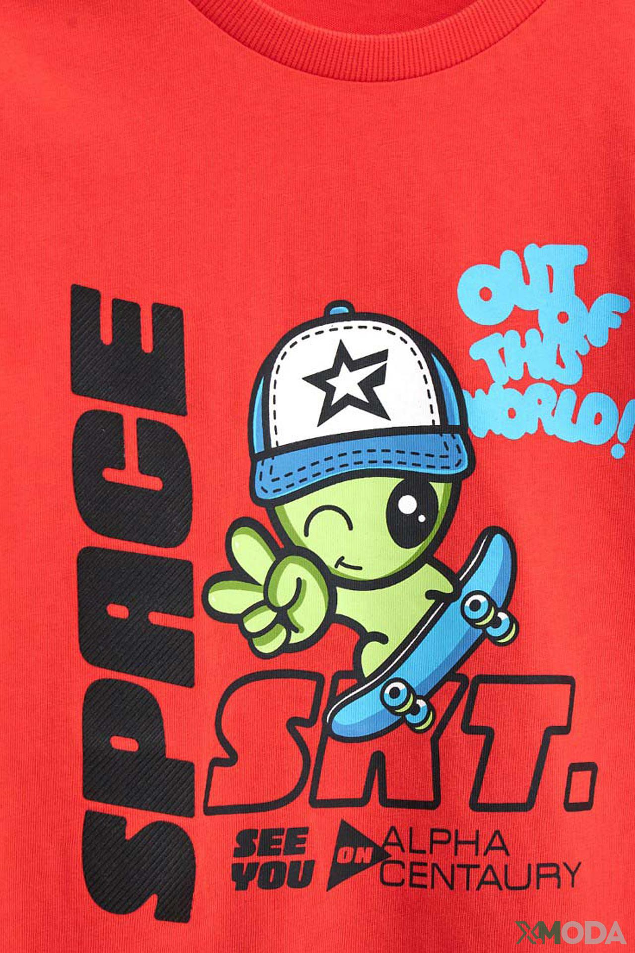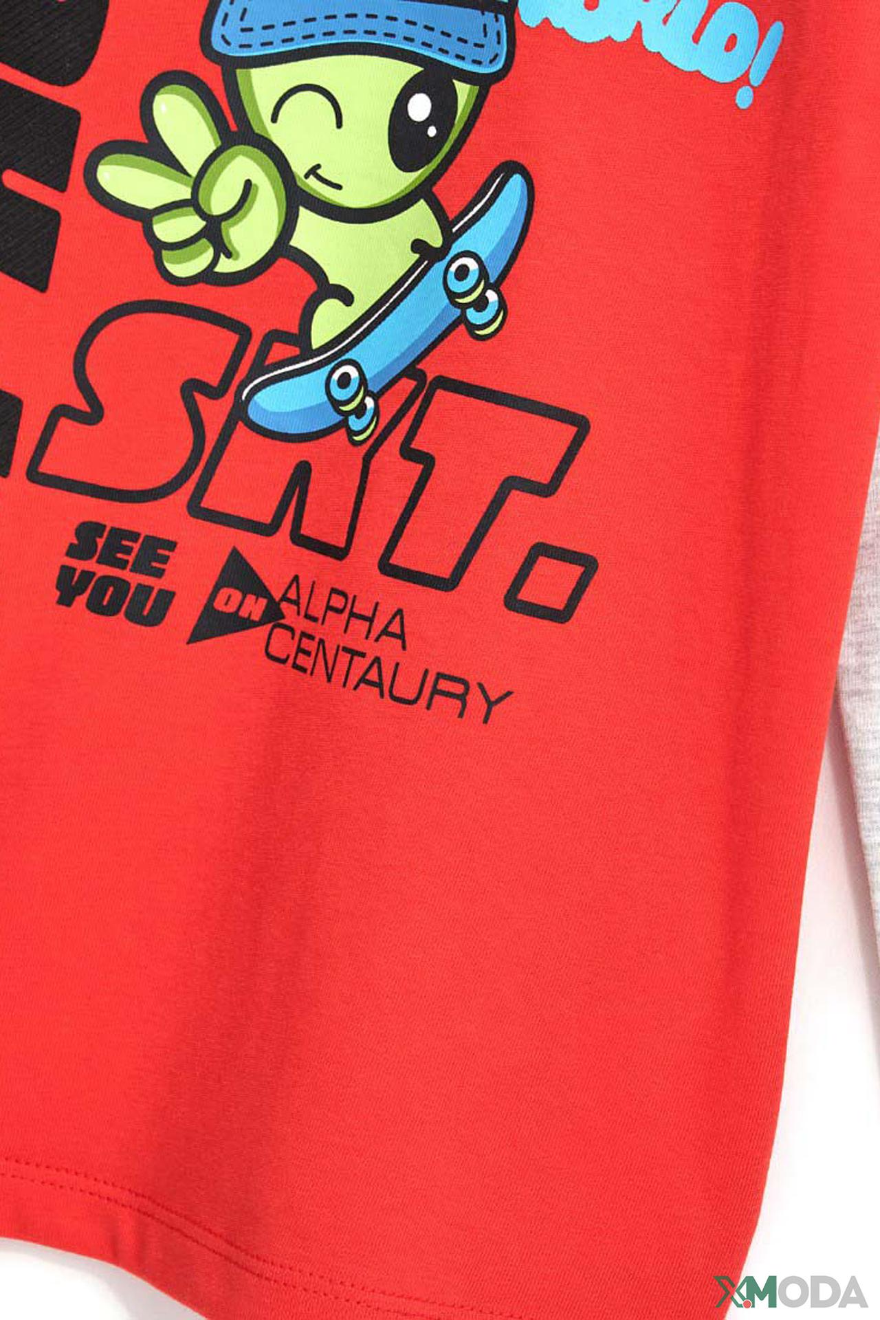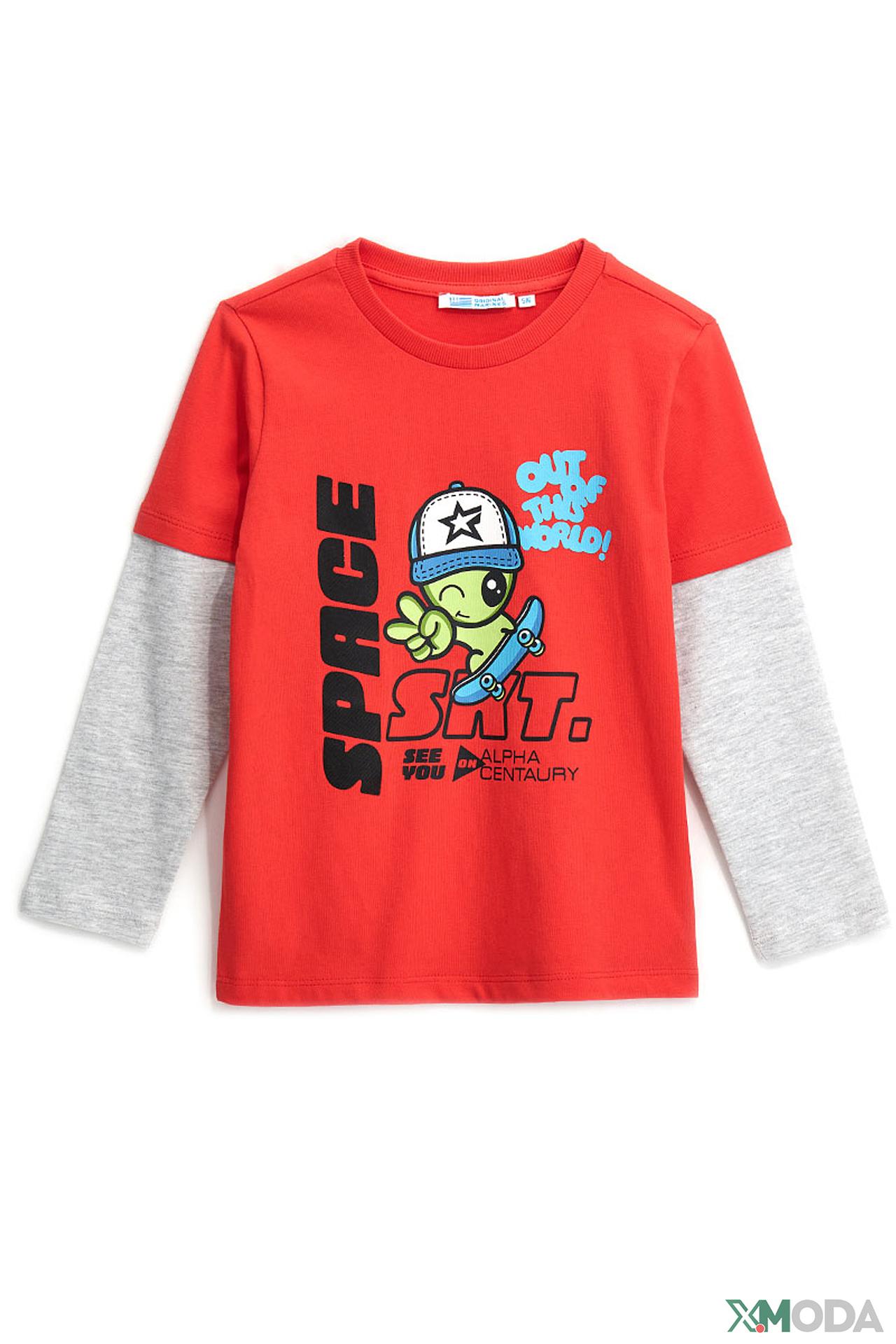 Детская футболка-лонгслив Original Marines в ярком красном цвете с имитацией серых рукавов создает модный многослойный образ. Дизайн дополнен оригинальным принтом с изображением забавного инопланетянина на скейтборде и тематическими надписями. Эта стильная и комфортная модель идеально подходит для активных детей, обеспечивая свободу движений в любой ситуации.