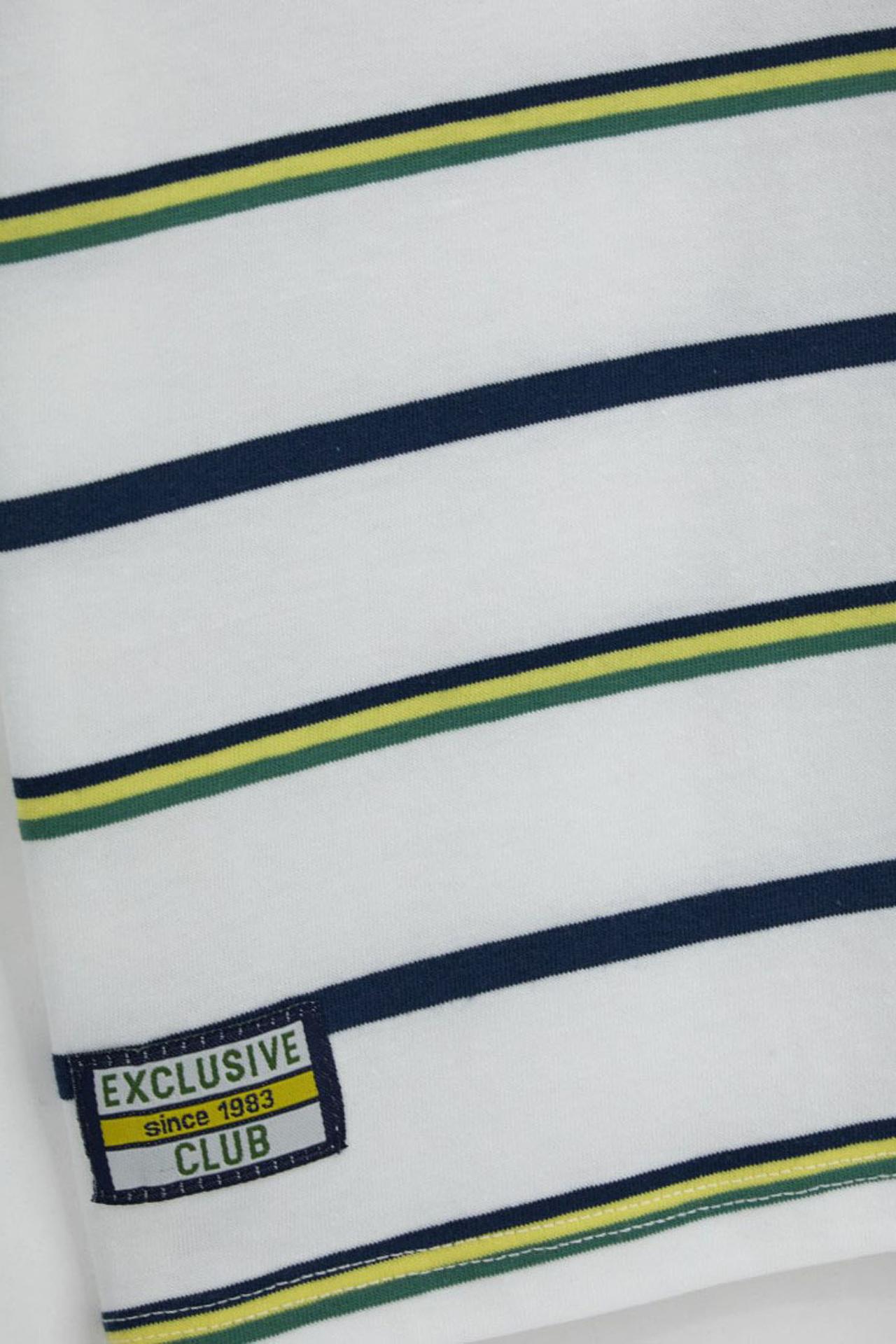 - Стильный дизайн: Классический белый фон украшен яркими горизонтальными полосками синего, желтого и зеленого цветов, создающими динамичный и свежий образ. Декоративная нашивка "EXCLUSIVE since 1983 CLUB" на боковом шве добавляет уникальности.