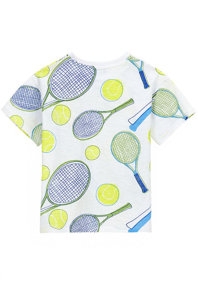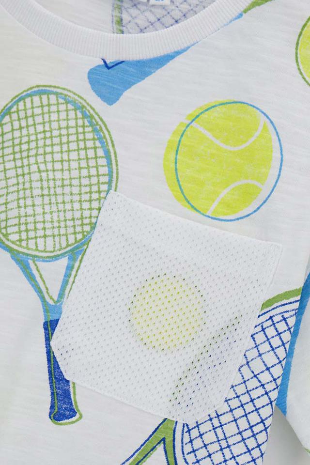 Футболка украшена забавным принтом в виде теннисных ракеток и мячей, выполненным в зелёных, голубых и жёлтых тонах. На груди расположен накладной карман из сетчатой ткани, добавляющий оригинальности образу.