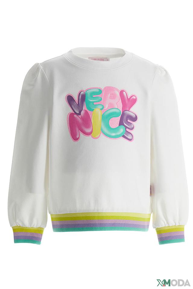 Свитшот Original Marines для девочки, молочного цвета, с ярким принтом "VERY NICE" и полосатыми манжетами. Изготовлен из мягкого хлопка с добавлением эластана для комфорта и свободы движений. Состав: хлопок 96%, эластан 4%