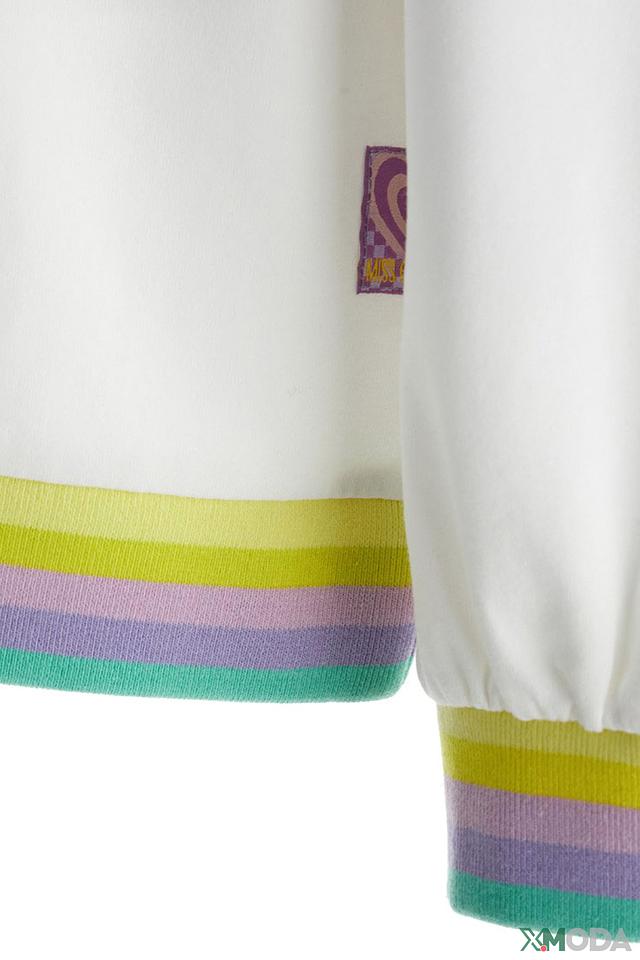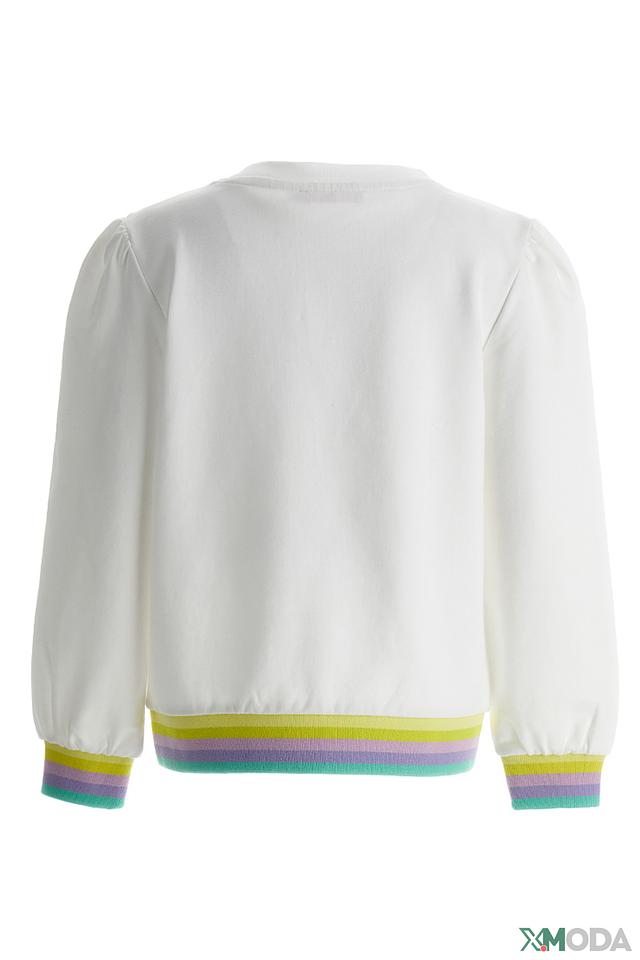 Свитшот имеет удобный крой с округлым вырезом горловины и рукавами-фонариками, что придает образу игривость и легкость. Манжеты и нижняя кромка с яркими разноцветными полосками добавляют стильный акцент.