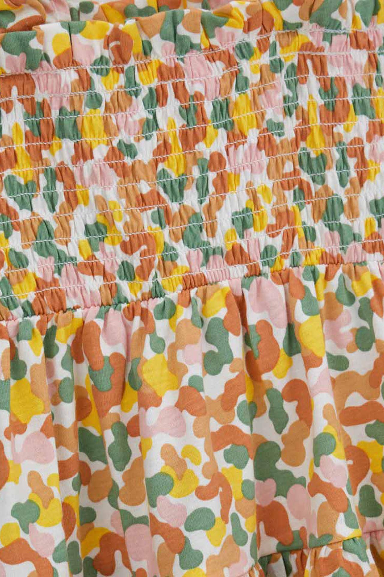 - Дизайн: Яркий разноцветный принт с абстрактными пятнами делает каждую модель уникальной, а ярусная юбка добавляет легкости и игривости образу. Присборенный лиф на резинке обеспечивает идеальную посадку без стеснения.