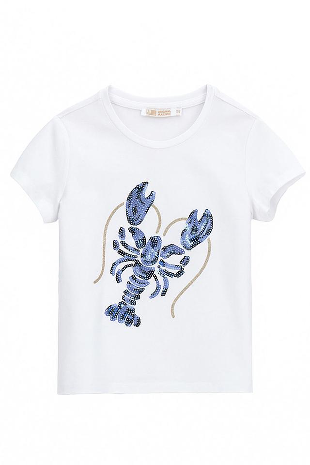 Белая футболка Original Marines для девочки, украшенная аппликацией в виде краба. Модель выполнена из мягкого хлопка с добавлением эластана для комфорта и свободы движений. Стильный и яркий дизайн. Состав: хлопок 92%, эластан 8%