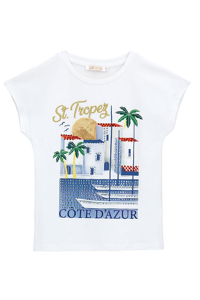 Эта стильная футболка от Original Marines станет отличным дополнением к гардеробу юной модницы. Футболка выполнена в белом цвете и украшена красочным принтом с изображением пейзажа Сен-Тропе, включая пальмы, здания и надписи "St. Tropez" и "Cote D'Azur".
