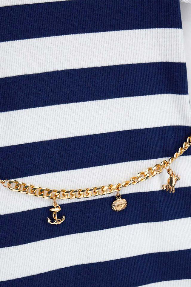 Модель имеет прямой крой, короткие рукава и круглый вырез горловины. Особый акцент в платье делает декоративная цепочка с подвесками в виде морских ракушек и якоря, которая придает образу игривость и оригинальность.
