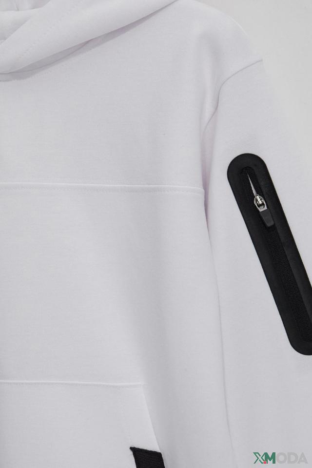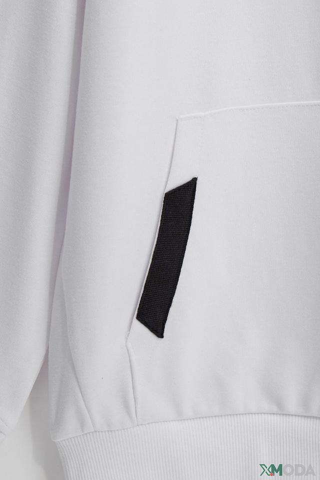Толстовка имеет удобный капюшон, который защитит от ветра и непогоды. На переднем плане расположен функциональный карман на молнии, где можно хранить небольшие предметы. Черные вставки на рукавах и кармане добавляют контраст и делают образ более динамичным.