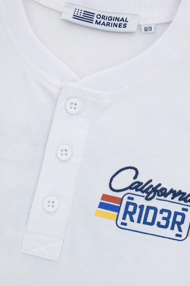 Белая футболка Original Marines для мальчиков с ярким принтом в виде автомобиля и надписью "California Rider". Изготовлена из 100% хлопка, обеспечивающего комфорт и воздухопроницаемость. Состав: хлопок 100%