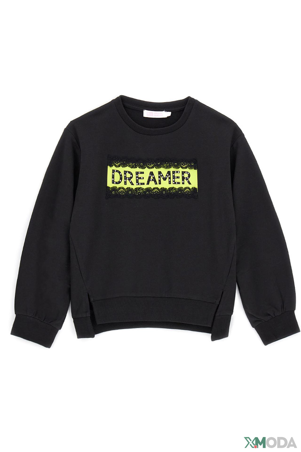 Стильный черный джемпер от Original Marines станет любимой вещью в гардеробе вашей девочки. Модель украшена яркой надписью "DREAMER", выполненной стразами, и элегантным кружевным кантом. Оригинальный дизайн придется по вкусу юным модницам.