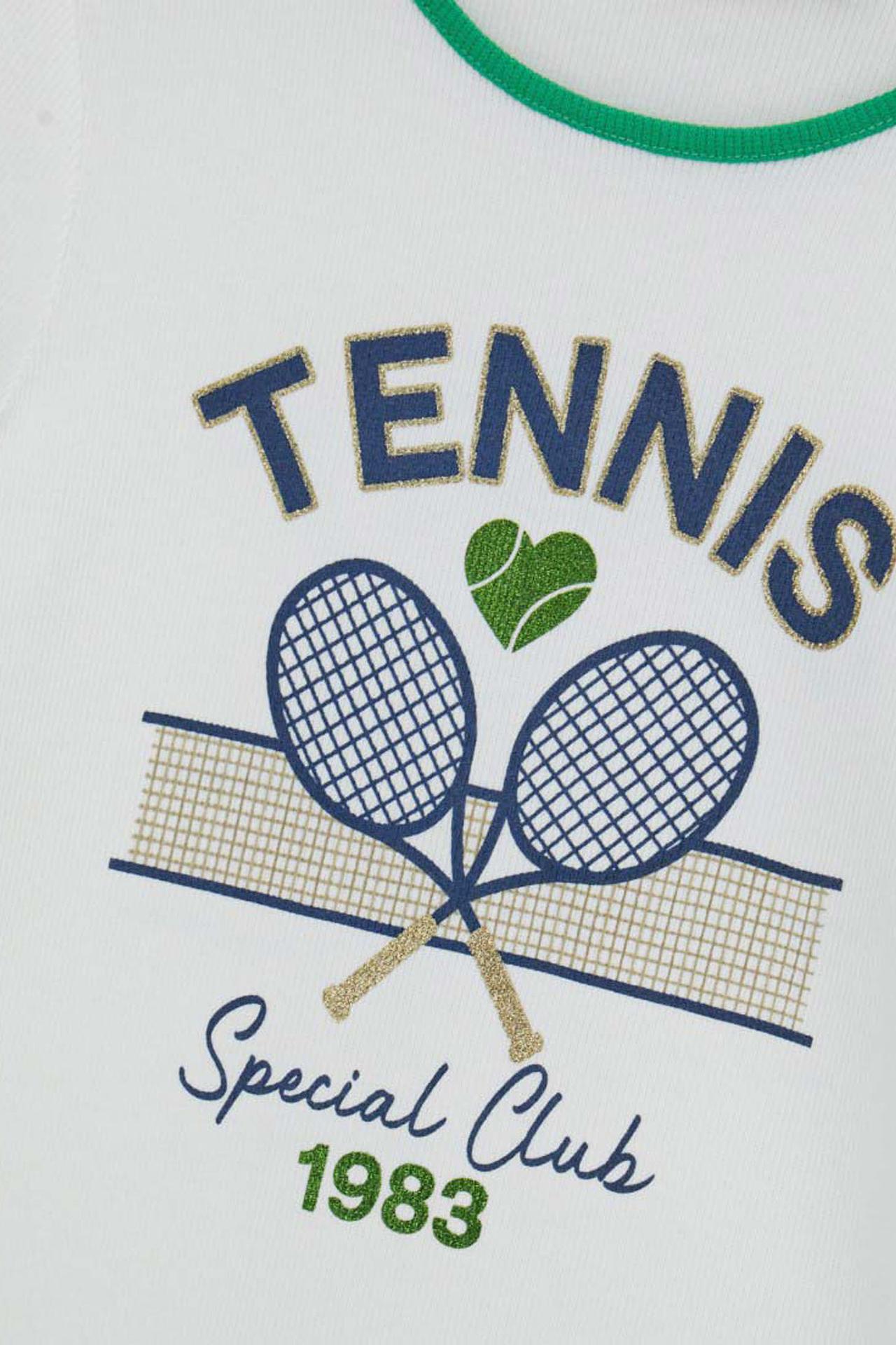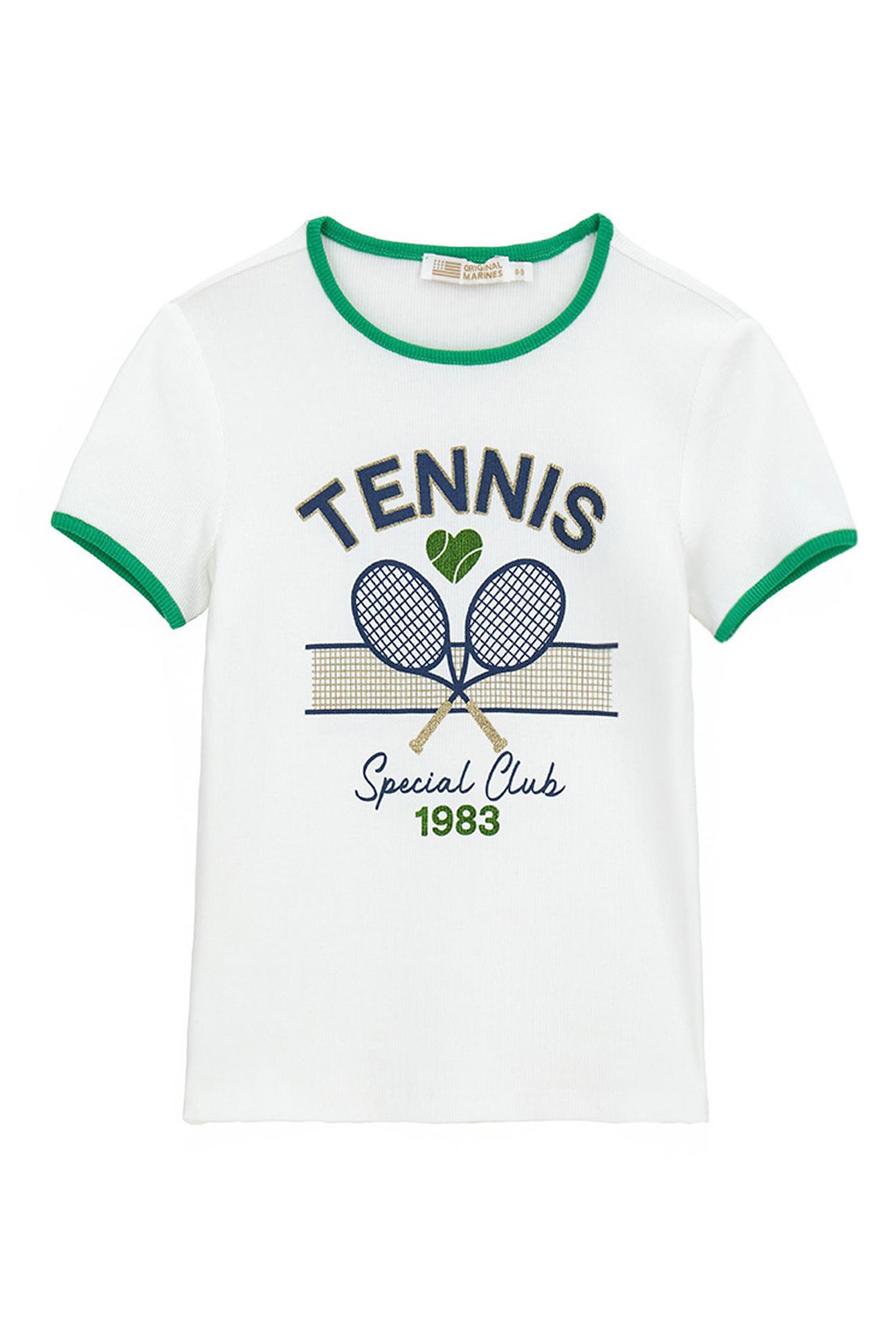 - Стильный спортивный дизайн: Белая основа футболки с выразительным принтом "TENNIS Special Club 1983" и контрастной зеленой отделкой по вороту и рукавам подчеркивает спортивный стиль и делает изделие привлекательным для мальчиков и девочек.