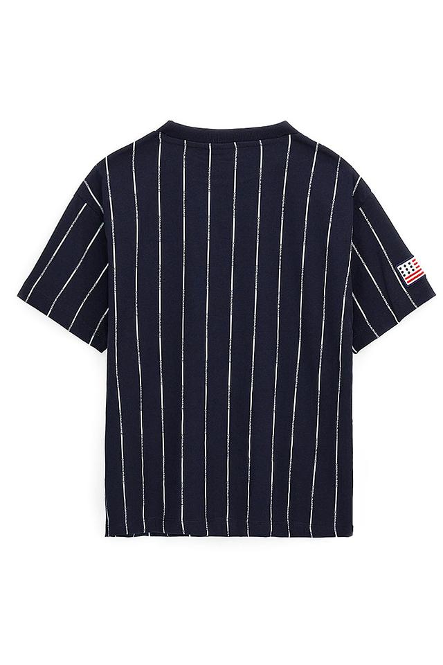 Футболка имеет классический крой и короткие рукава, что делает ее идеальной для активного отдыха и повседневной носки. Вертикальные полосы синего цвета создают модный и динамичный образ.