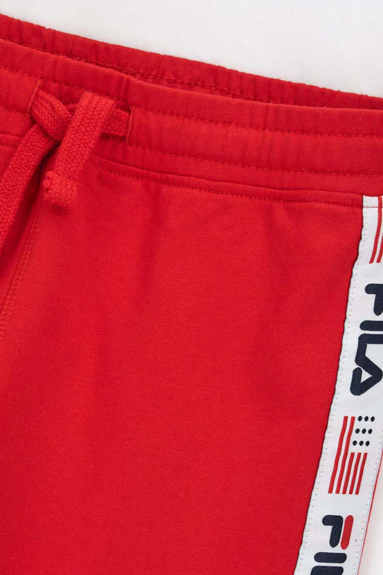 - Дизайн: Яркий красный цвет в сочетании с контрастными белыми лампасами и брендированием Fila создает динамичный и трендовый образ. Эти штаны для мальчика легко комбинируются с различными верхами.