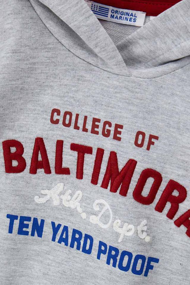 - Дизайн: Классический серый цвет джемпера дополнен эффектным принтом в стиле колледжа с бордовыми и синими буквами. Контрастная бордовая подкладка капюшона придает изделию завершенный вид.