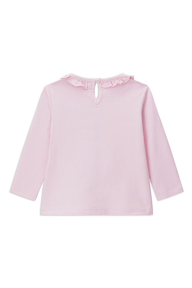 Розовая футболка Original Marines для девочки с длинными рукавами и воротником-стойкой, украшенным рюшами. Модель дополнена ярким принтом с изображением двух милых девочек. Состав: хлопок 92%, эластан 8%