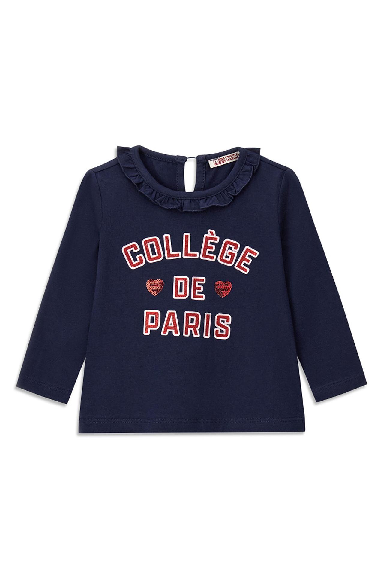 - Дизайн: Классический крой с длинным рукавом и изящным воротником-ободком. Оригинальный принт "Collège de Paris" с блестящими деталями делает футболку модной и привлекательной для юных модниц.