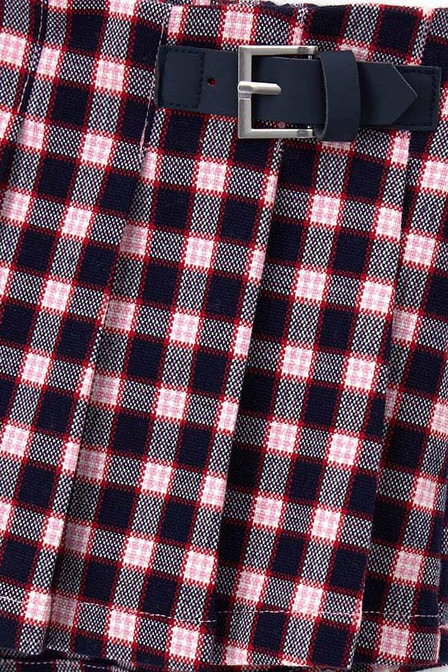 Дизайн юбки выполнен в классическую клетку, сочетающую в себе оттенки синего, красного и белого. Эластичный пояс и аккуратный ремешок с пряжкой придают модели завершенный вид. Юбка-шорты идеально подходит для повседневной носки, прогулок и особых случаев.