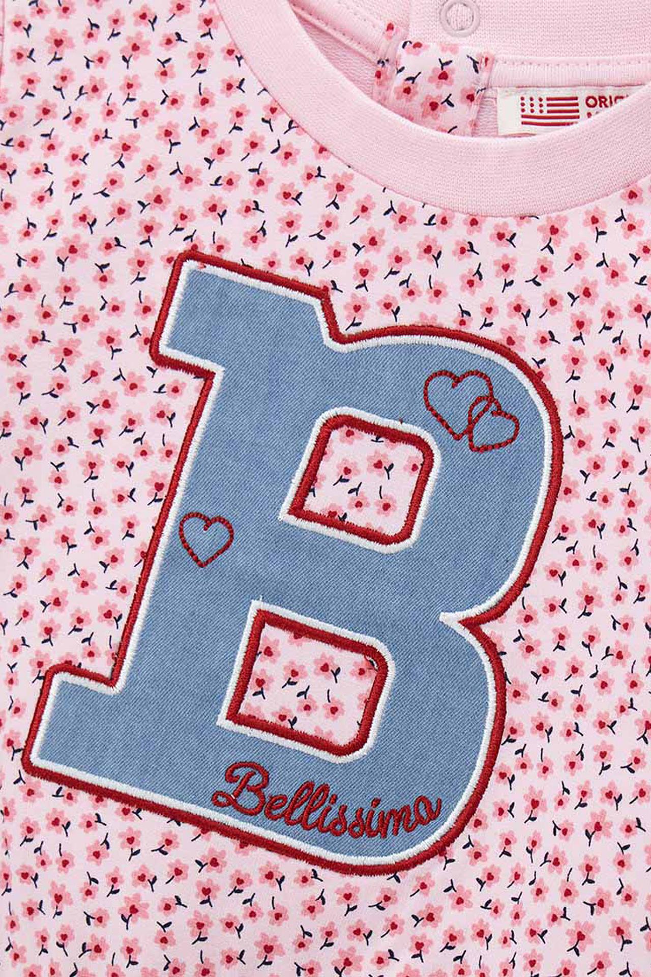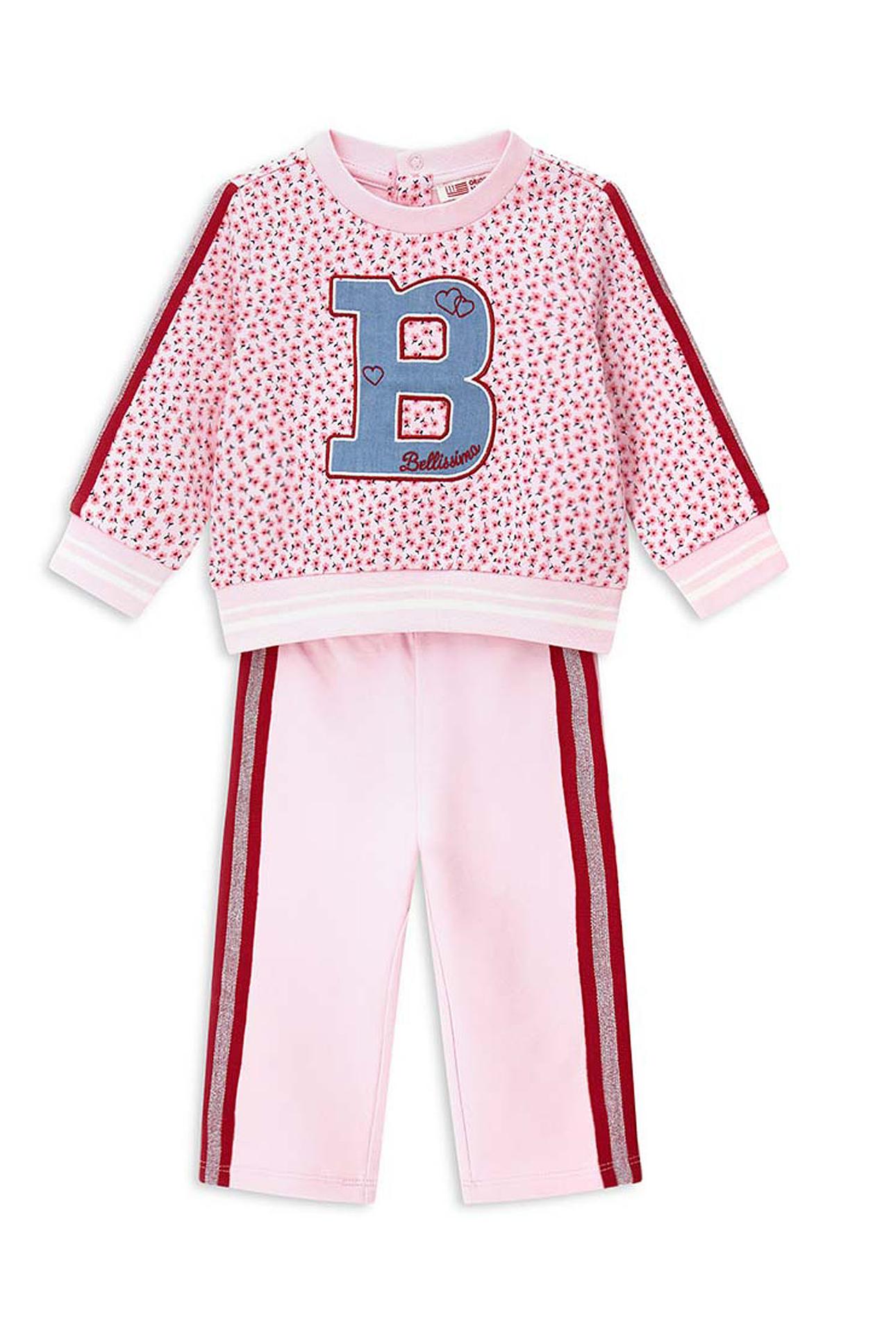 Стильный и удобный детский костюм от Original Marines, состоящий из джемпера и брюк, станет незаменимой частью гардероба вашей малышки. Нежный розовый цвет, украшенный мелким цветочным принтом, и контрастные лампасы на брюках придают изделию особый шарм. Декоративная буква "B" с надписью "Bellissima" и милыми сердечками на джемпере добавляют игривости.
