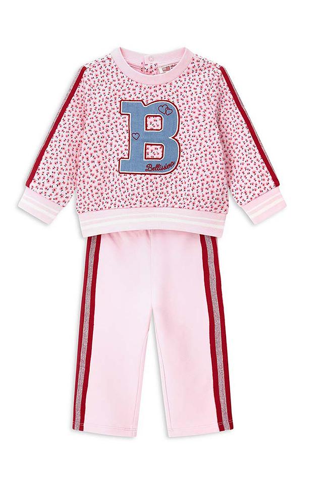 Джемпер украшен ярким цветочным принтом и аппликацией в виде буквы "B" с надписью "Bellissimo". Брюки также выполнены в нежно-розовом цвете и дополнены красными полосками по бокам.