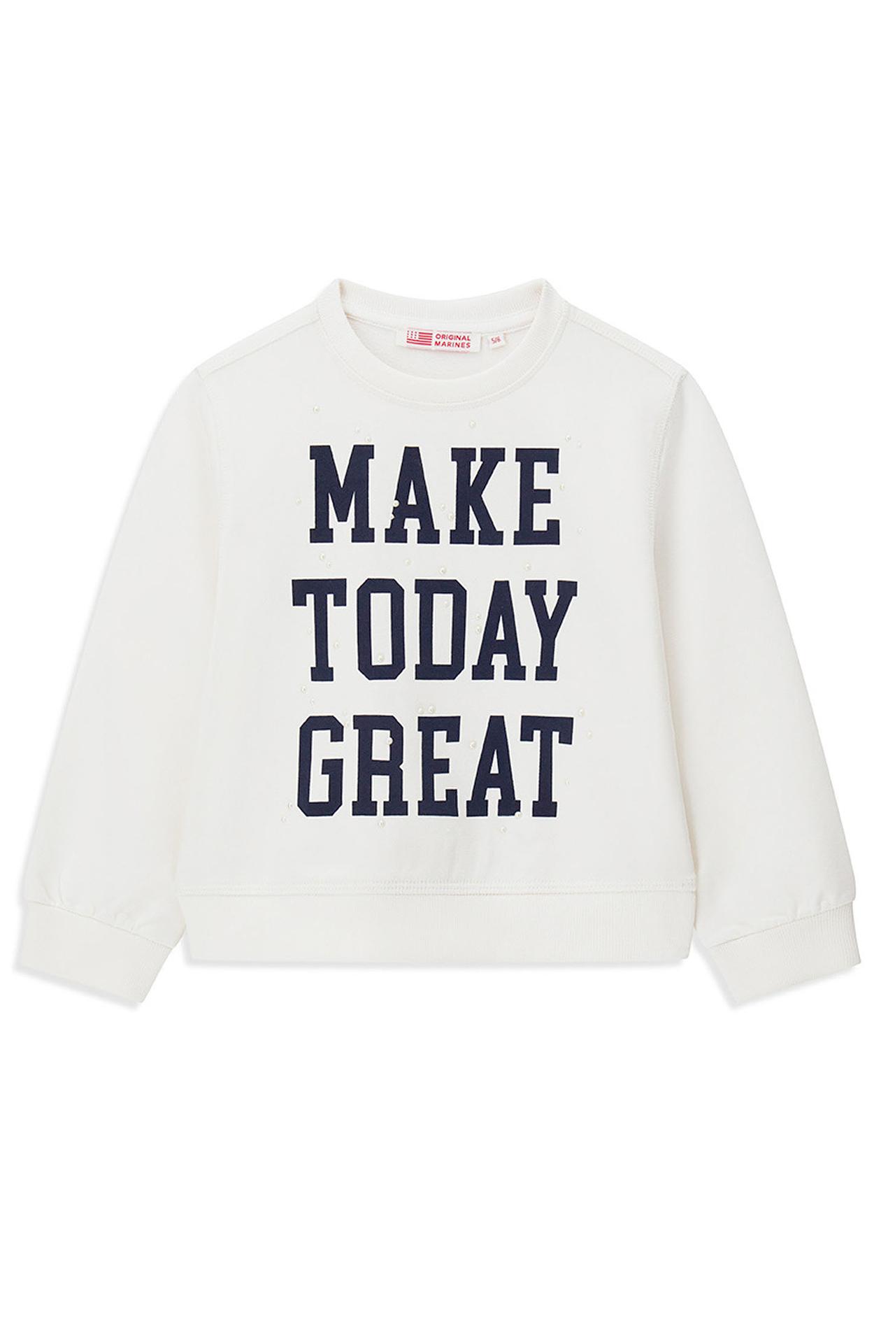 - Дизайн: Классический джемпер с круглым вырезом и длинными рукавами. На груди расположена крупная надпись "MAKE TODAY GREAT", украшенная мелкими жемчужными бусинами, что придает изделию особый шарм и оригинальность.