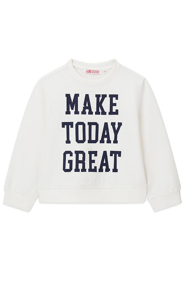 Белый джемпер Original Marines для девочки с яркой надписью "MAKE TODAY GREAT". Изготовлен из мягкого хлопка с добавлением эластана для комфорта и свободы движений. Состав: хлопок 96%, эластан 4%