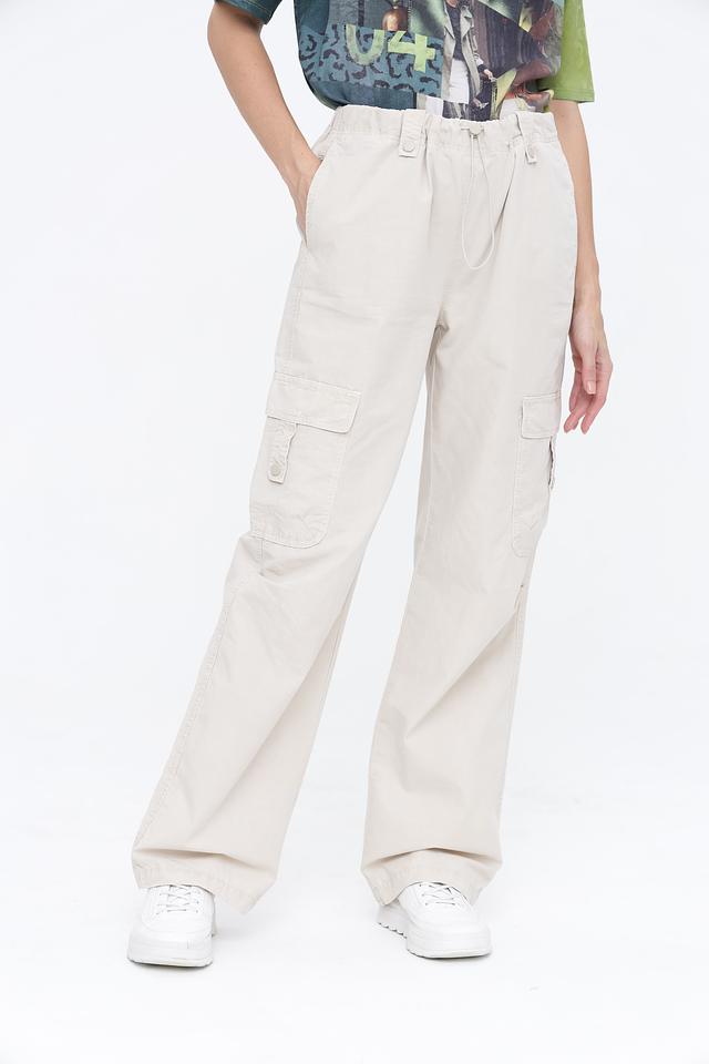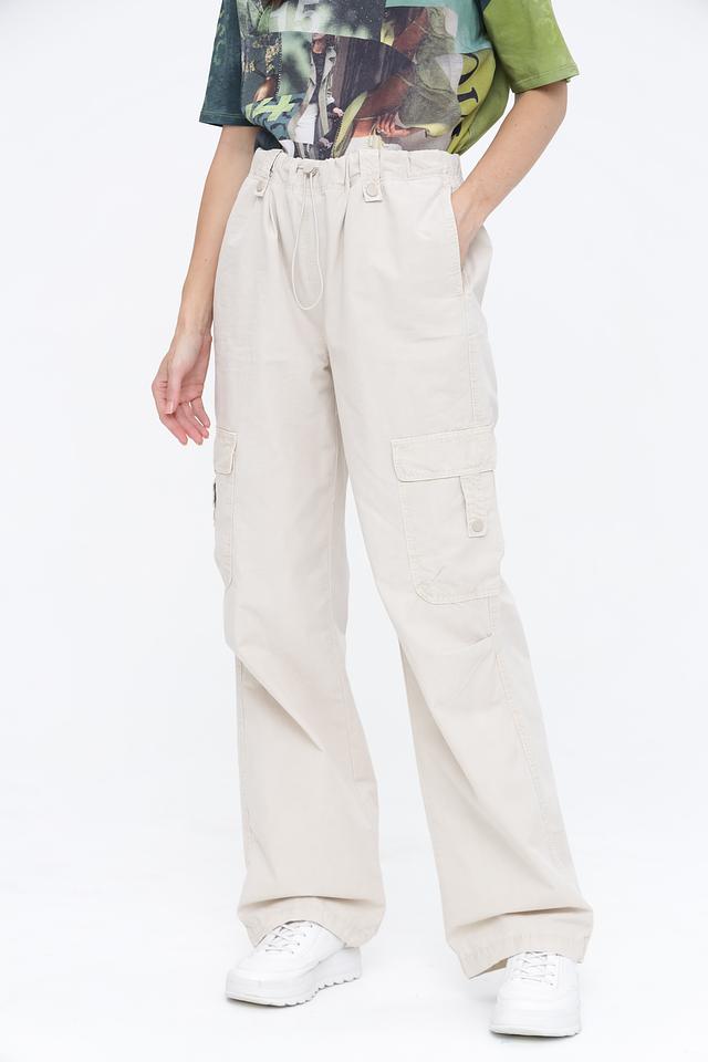 Брюки имеют свободный крой и широкие штанины, что обеспечивает свободу движений и создает расслабленный образ. Функциональные накладные карманы добавляют практичности и подчеркивают стиль карго. Эластичный пояс с регулирующим шнурком обеспечивает надежную посадку по фигуре.