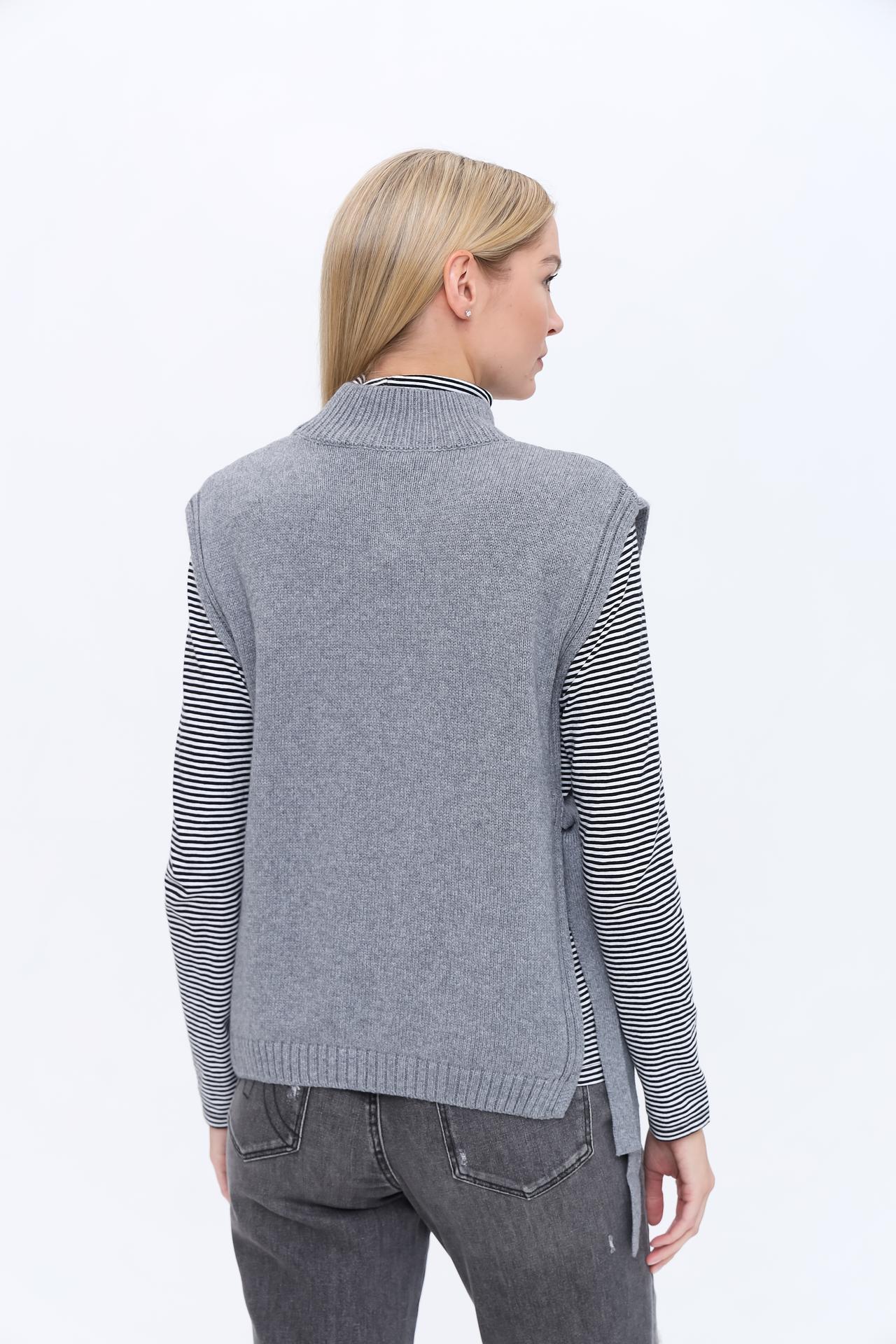 Жилет оснащен боковыми завязками, которые позволяют регулировать посадку и добавляют изюминку в дизайн. Высокий воротник-стойка обеспечивает дополнительный комфорт и тепло.