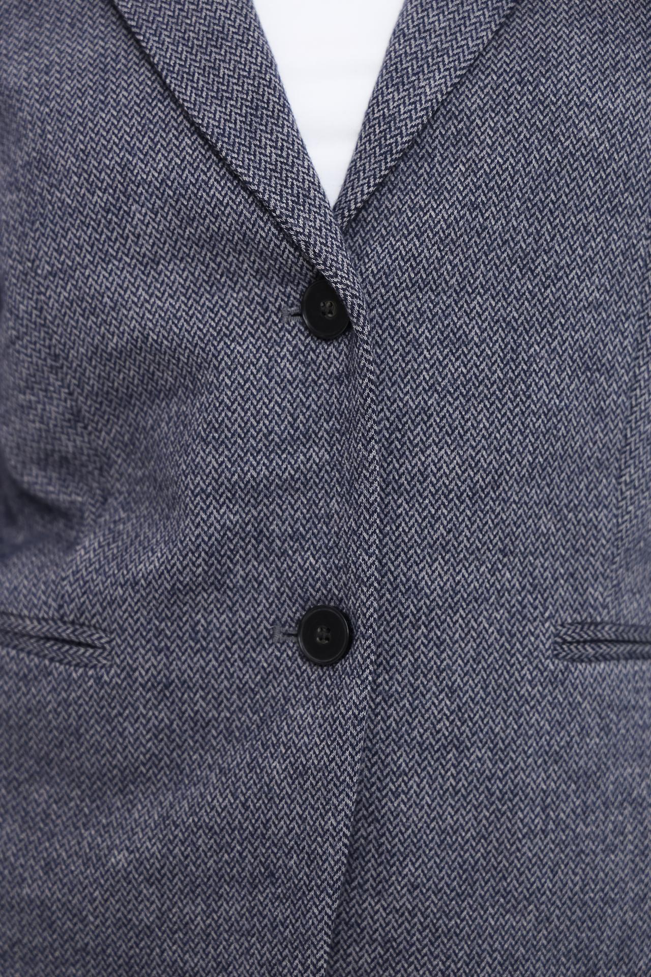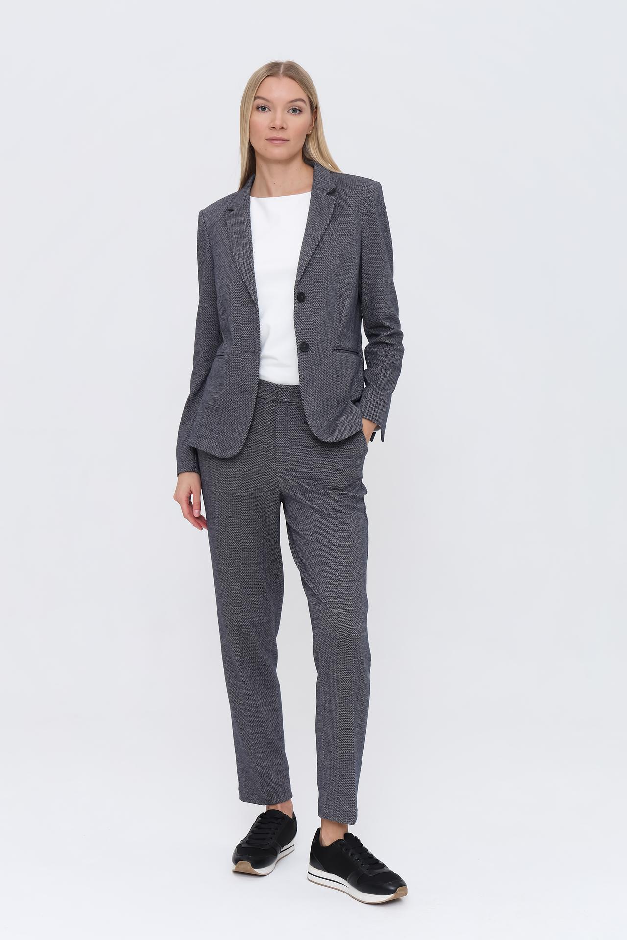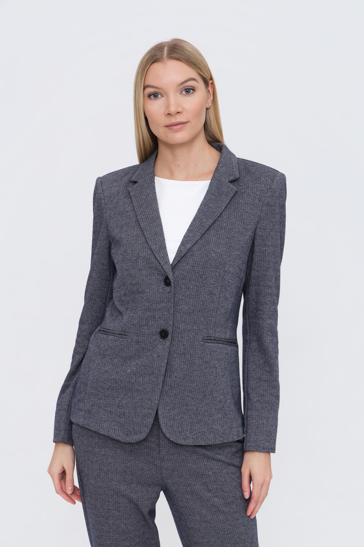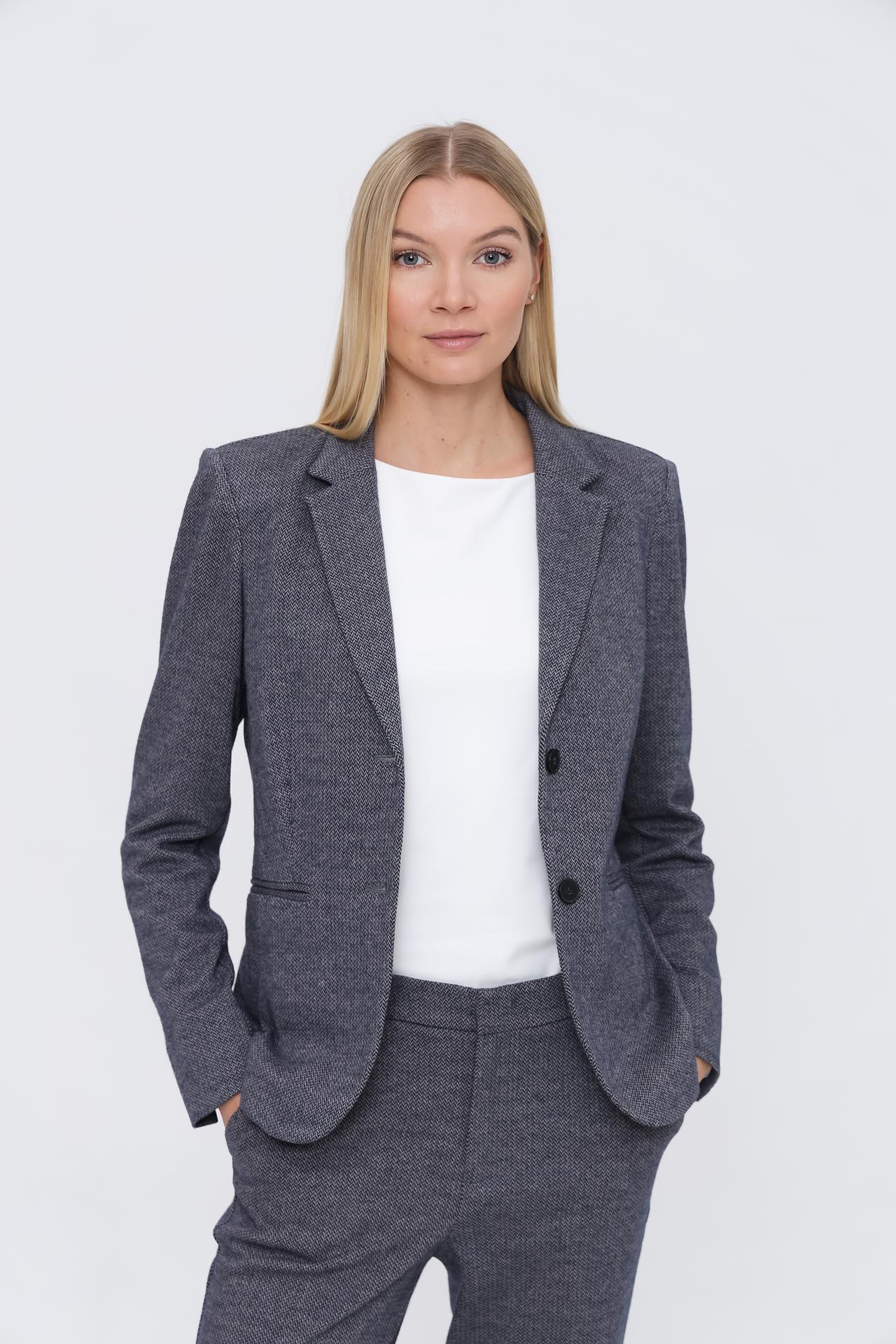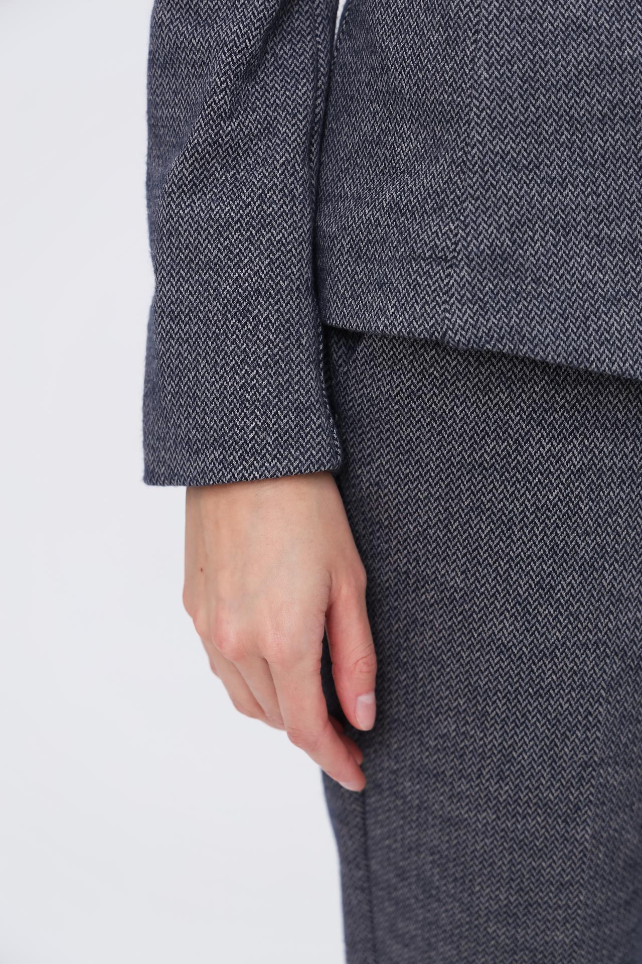 - Дизайн: Отложной воротник и лацканы создают строгий, но элегантный образ. Узор «ёлочка» в сером цвете делает жакет универсальным и стильным.