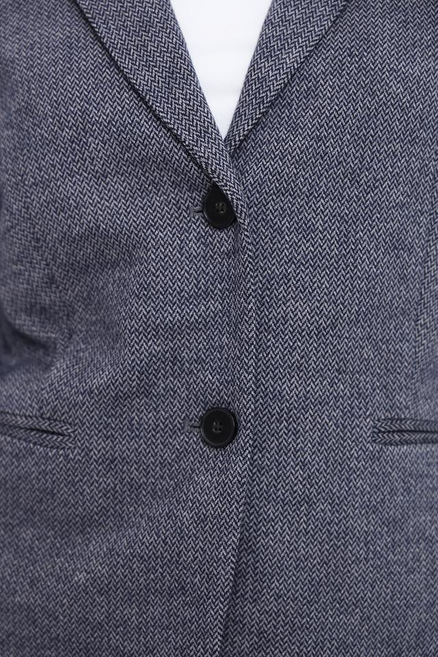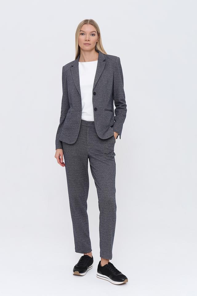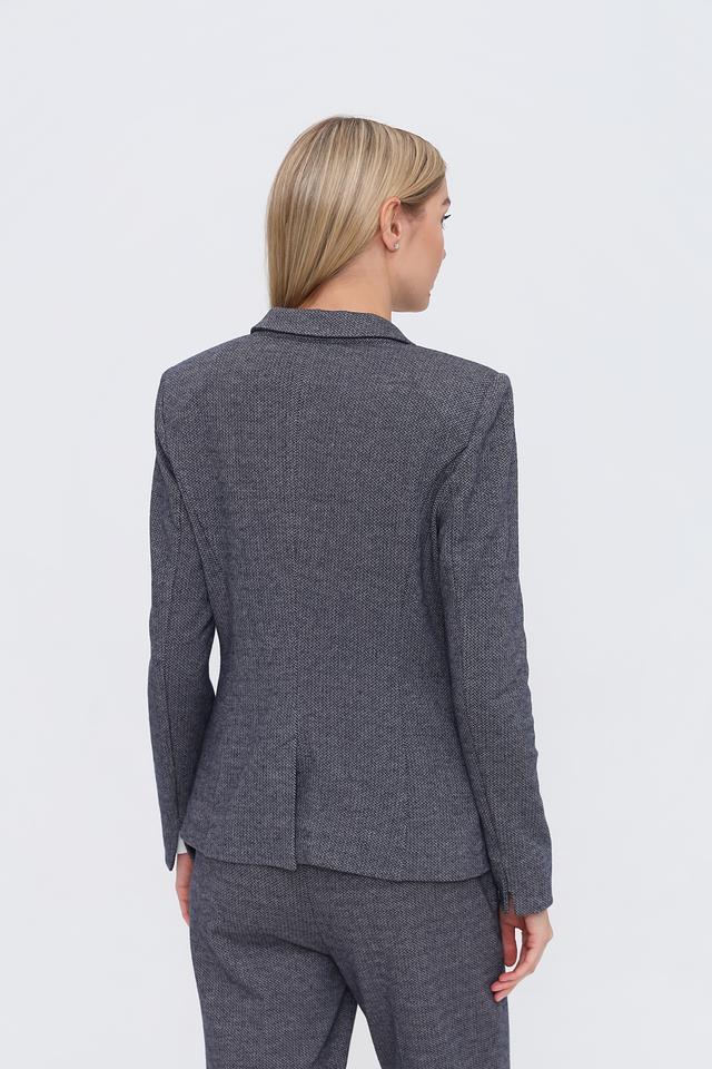 Состав ткани: 66% полиэстер, 31% вискоза, 3% эластан. Это сочетание материалов обеспечивает жакету приятные тактильные ощущения, хорошую посадку по фигуре и устойчивость к сминанию.