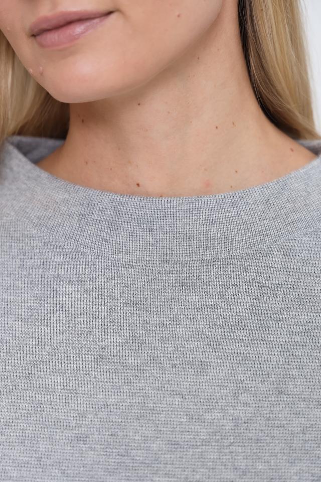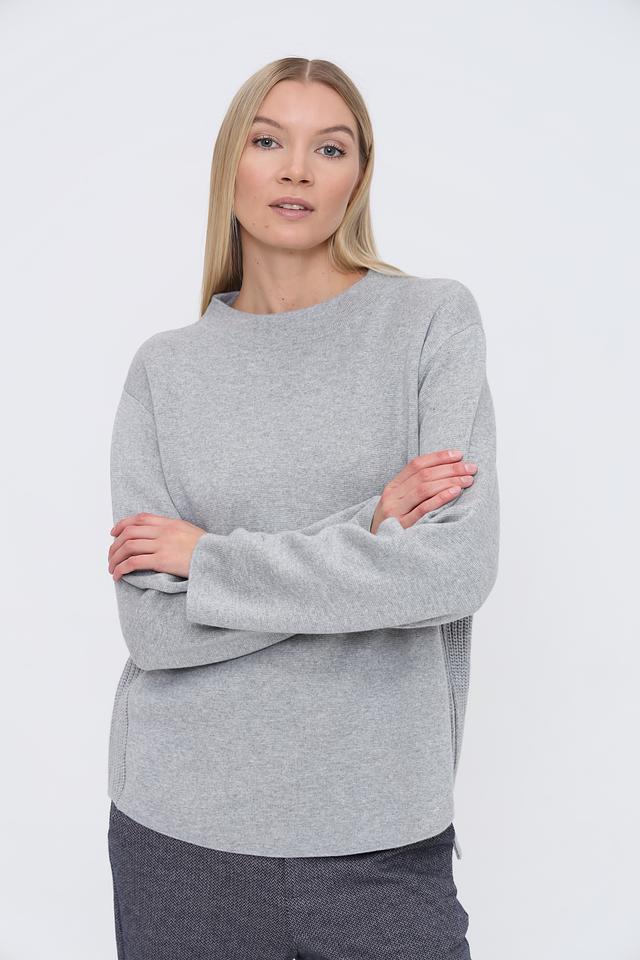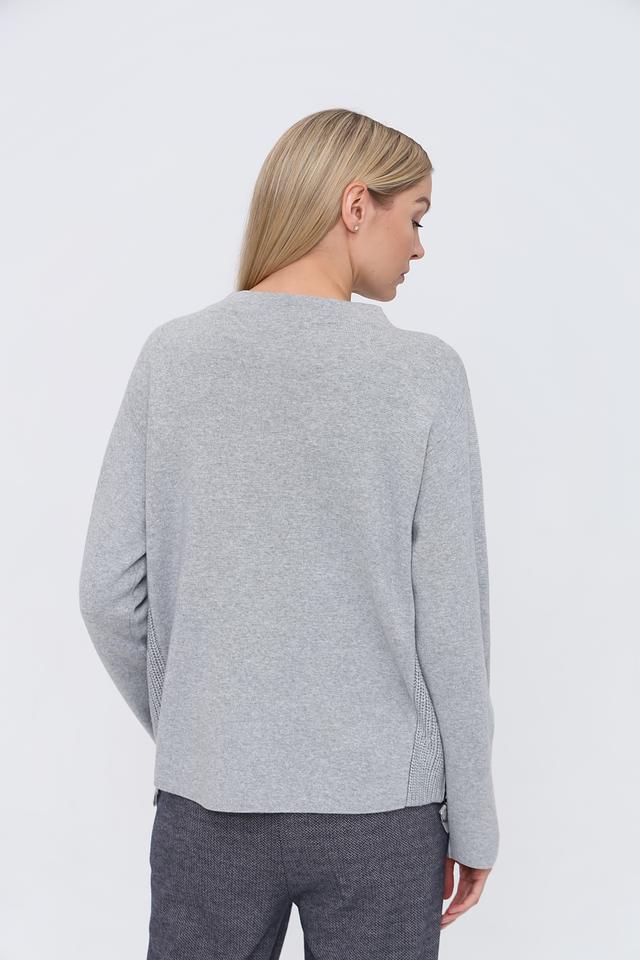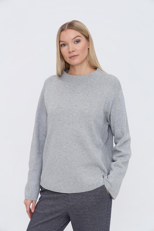Особенностью модели являются декоративные вставки из сетки по бокам, которые придают ей оригинальность и современный вид. Пуловер имеет круглый вырез горловины и длинные рукава.