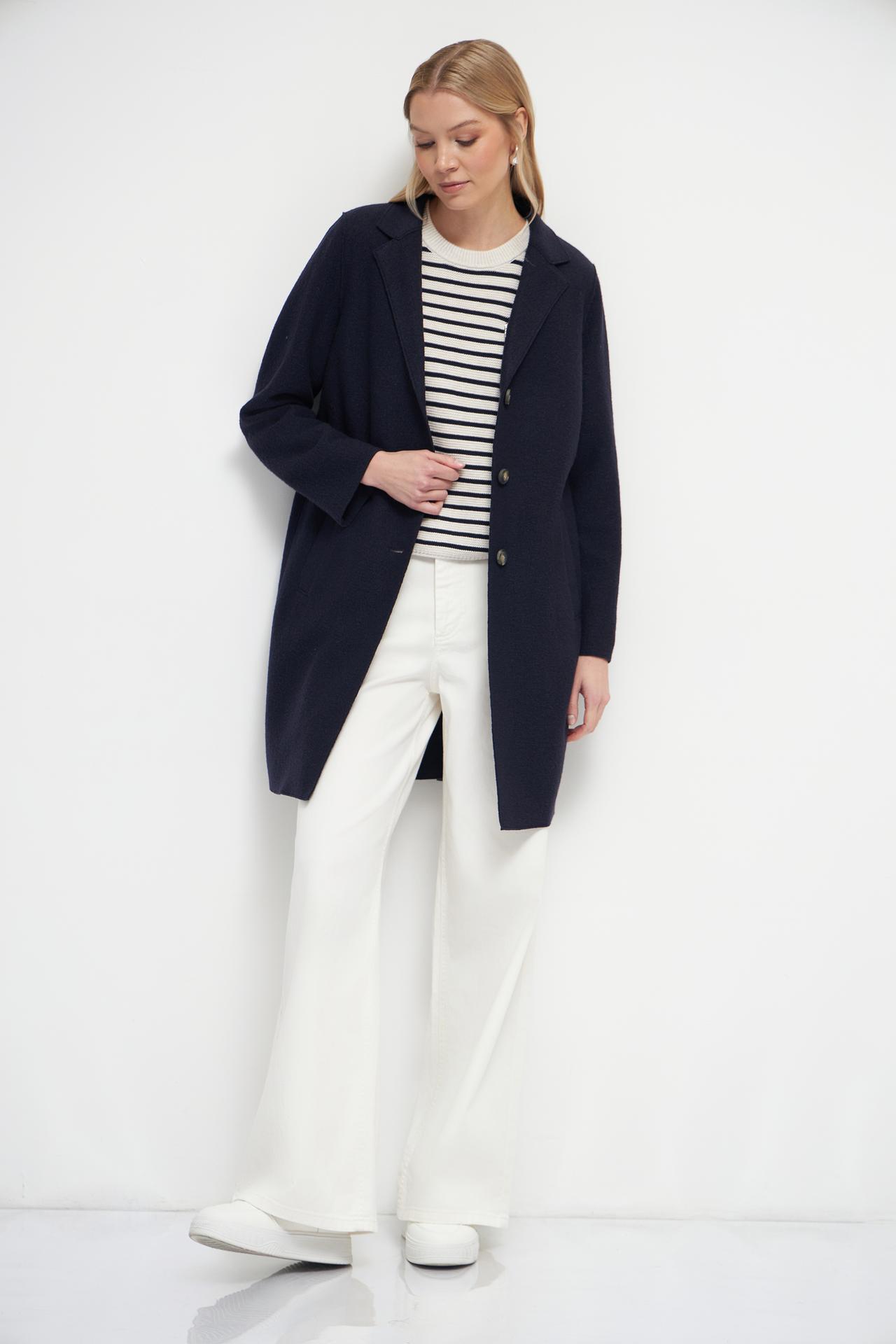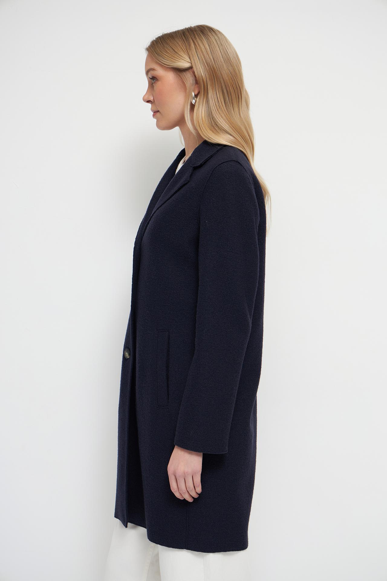 Классический крой пальто обеспечивает идеальную посадку по фигуре, а темно-синий цвет добавляет шарма и универсальности. Это пальто легко сочетается с различными элементами гардероба, позволяя создавать как повседневные, так и более формальные образы.